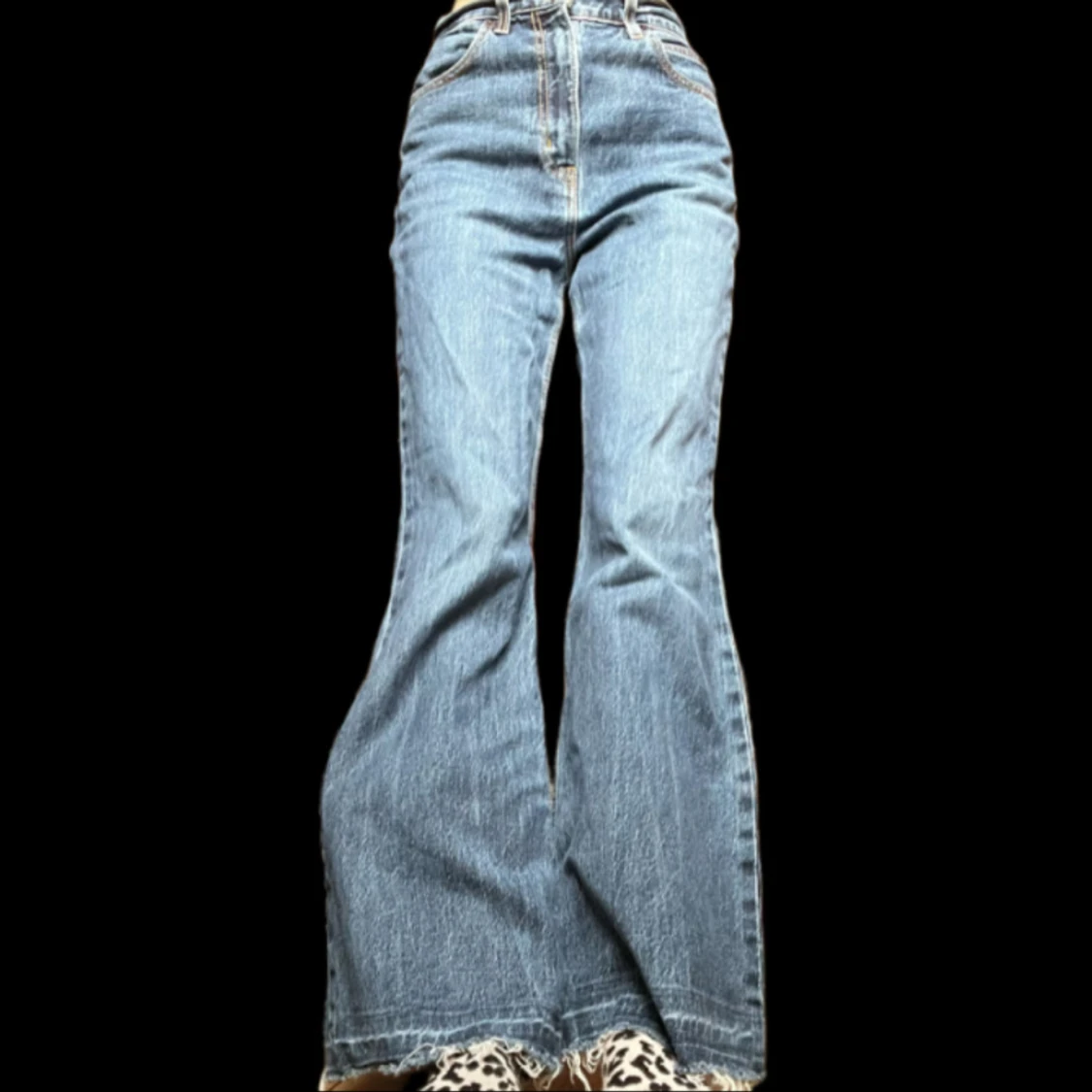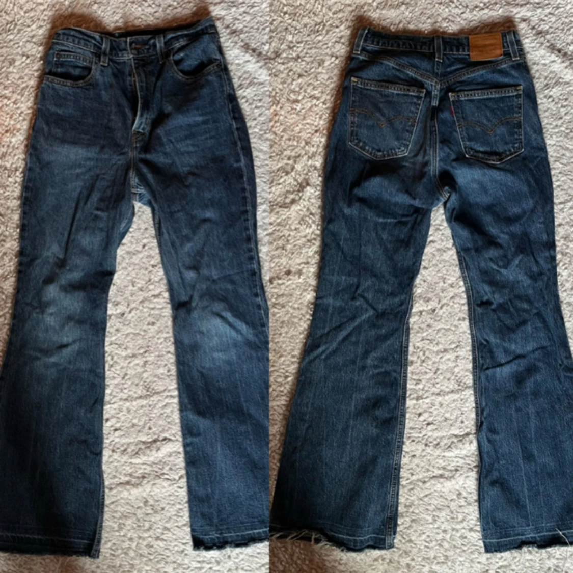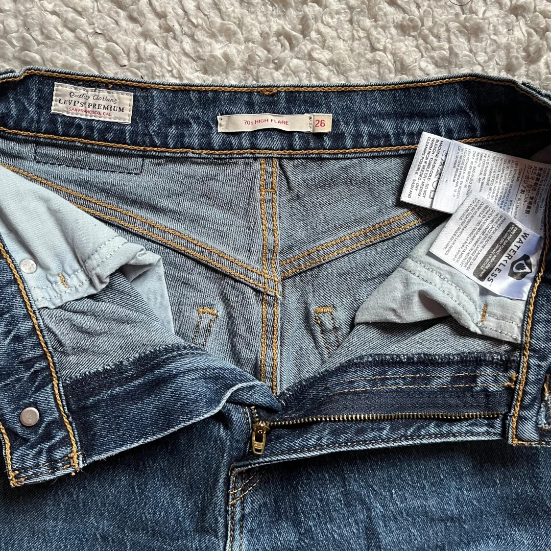 Snygga Levis jeans inspirerade av 70-talet med hög midja och flare. Storlek 26 i midjan och skulle uppskatta den allmänna storleken till S. Mycket bra skick!