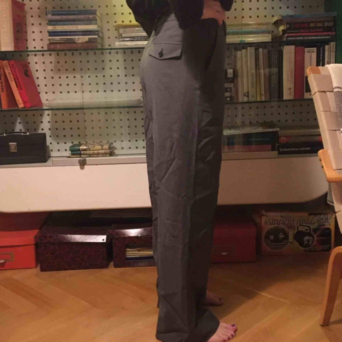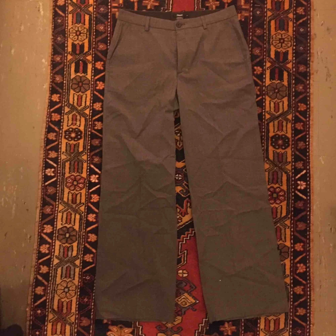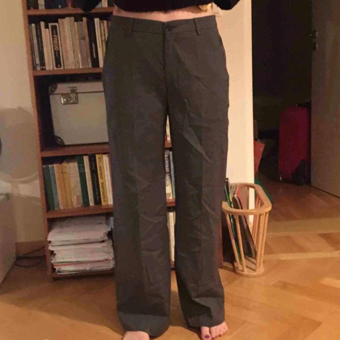 Perfekta kostymbyxor från Filippa K! Raka i modellen och relativt hög midja. Står storlek M på, men tycker mer att de är S. Personen på bilden har storlek XS och 165 cm lång