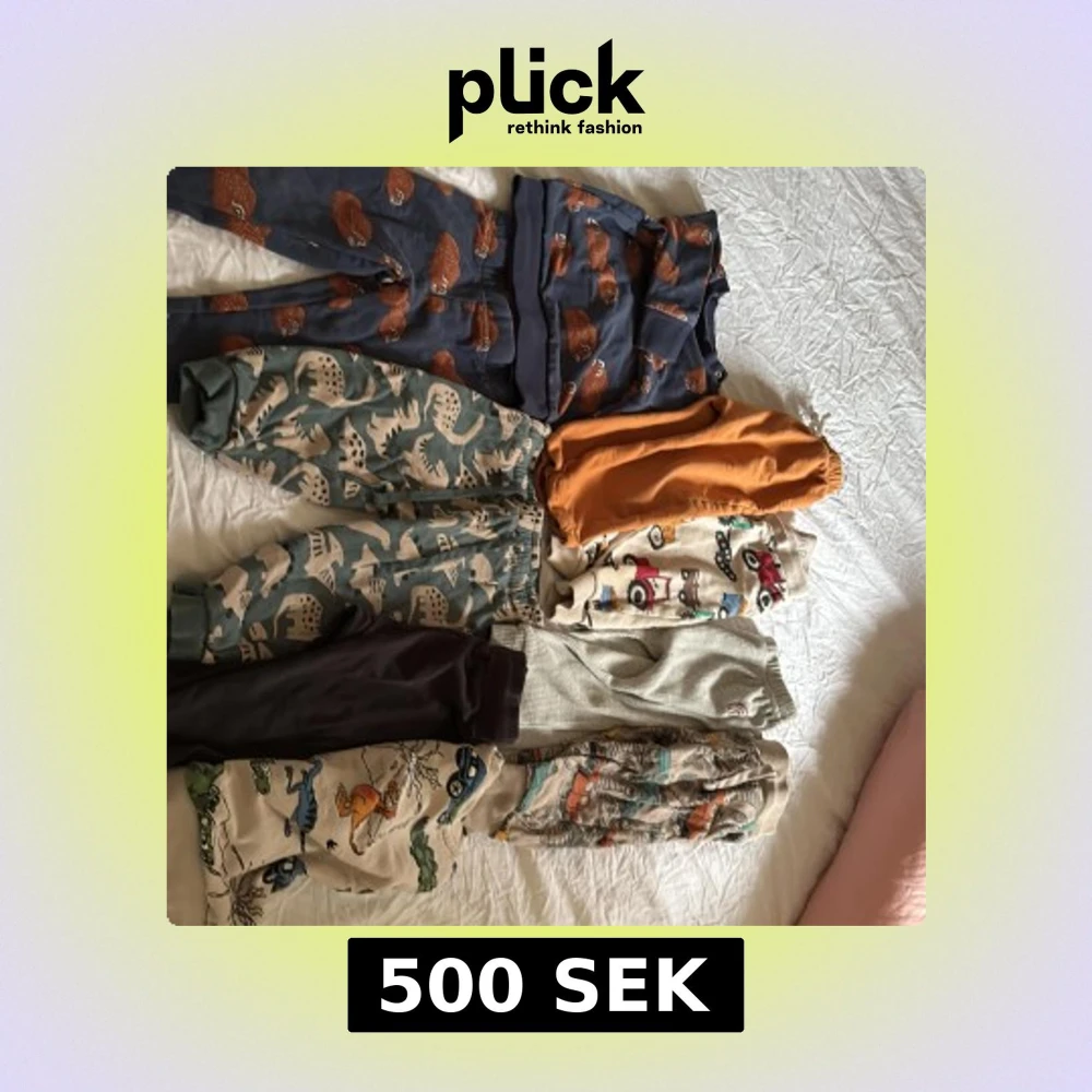 Säljer ett gäng mjukisbyxor i olika färger och mönster, bland annat blå med björnar, gröna med dinosaurier, orange, beige med traktorer och flerfärgade med bilar och djur. Perfekta för chill dagar och lek, mjuka muddar och elastisk midja. Har även matchande tröjor till byxorna på bilden