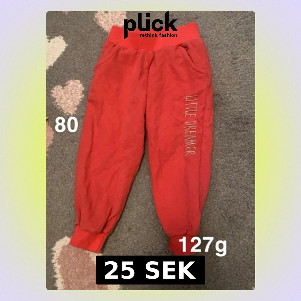 Säljer ett par rosa mjukisbyxor med bred resår i midjan och muddar vid bensluten. Byxorna har fickor och texten 'LITTLE DREAMER' broderad längs ena benet. Perfekta för chill dagar hemma eller till förskolan.🌸 Fint använt skick. Storlek 80