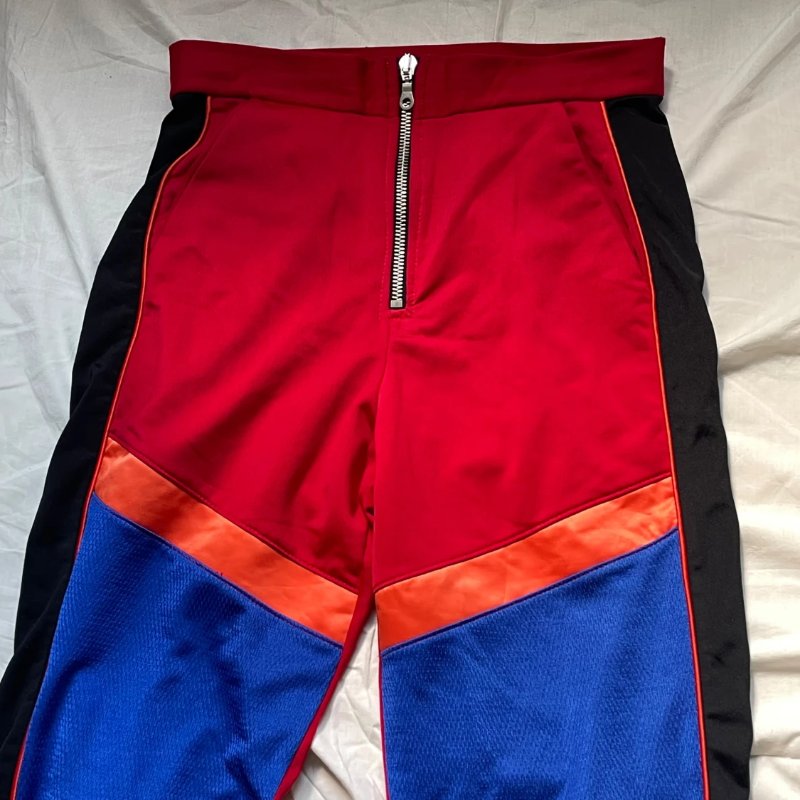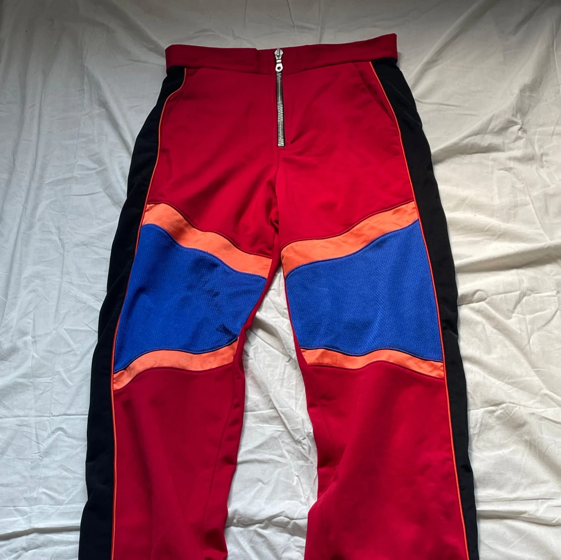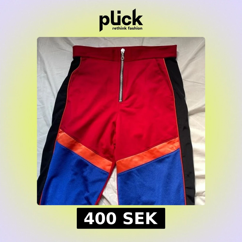 Unika byxor från The Ragged Priest i rött med svarta sidor, blå meshpaneler och orange detaljer. Byxorna har hög midja, dragkedja framtill och är gjorda i 100% polyester. Perfekta för dig som vill sticka ut med en färgstark och edgy stil. Storleken är mindre, passar S/M. Aldrig använda.