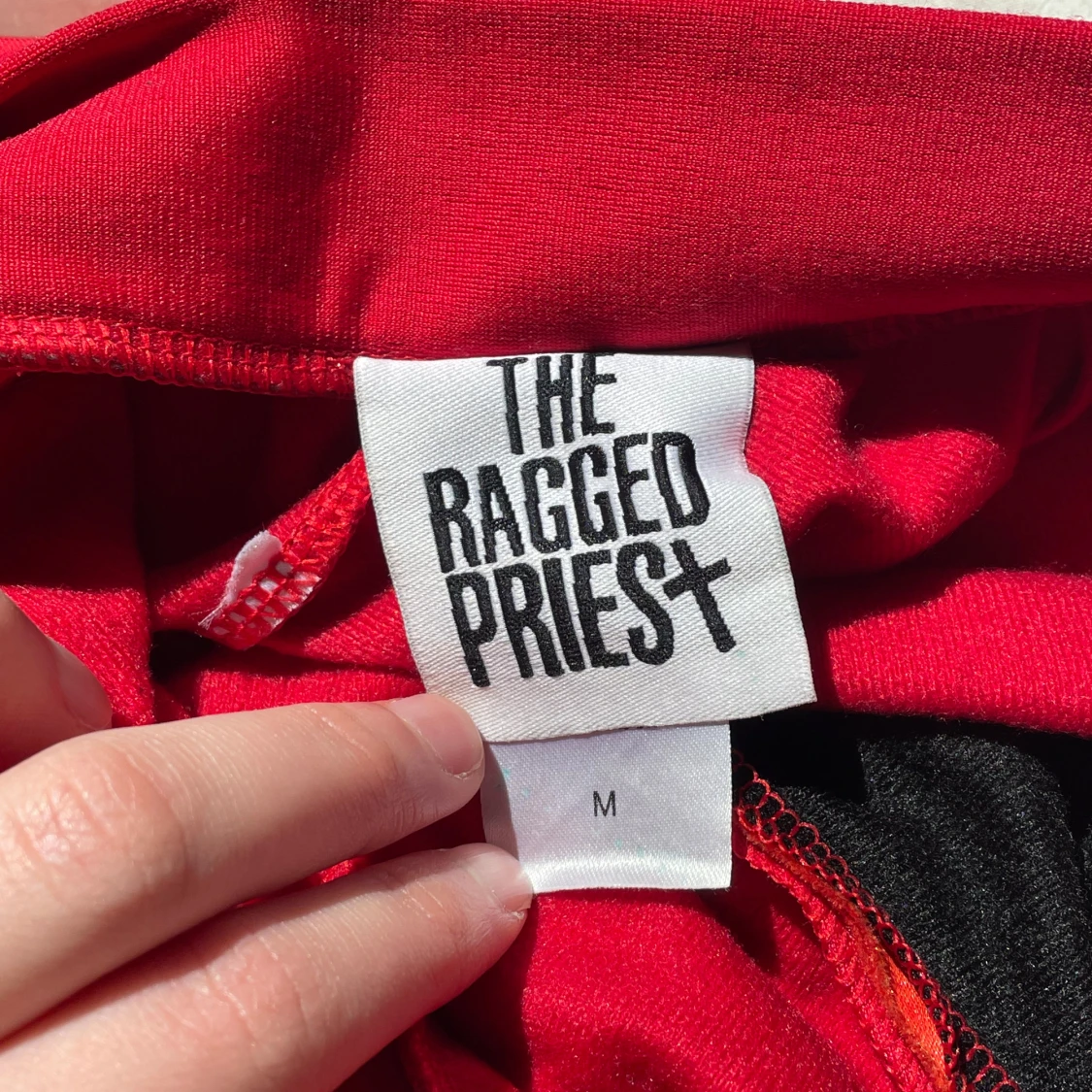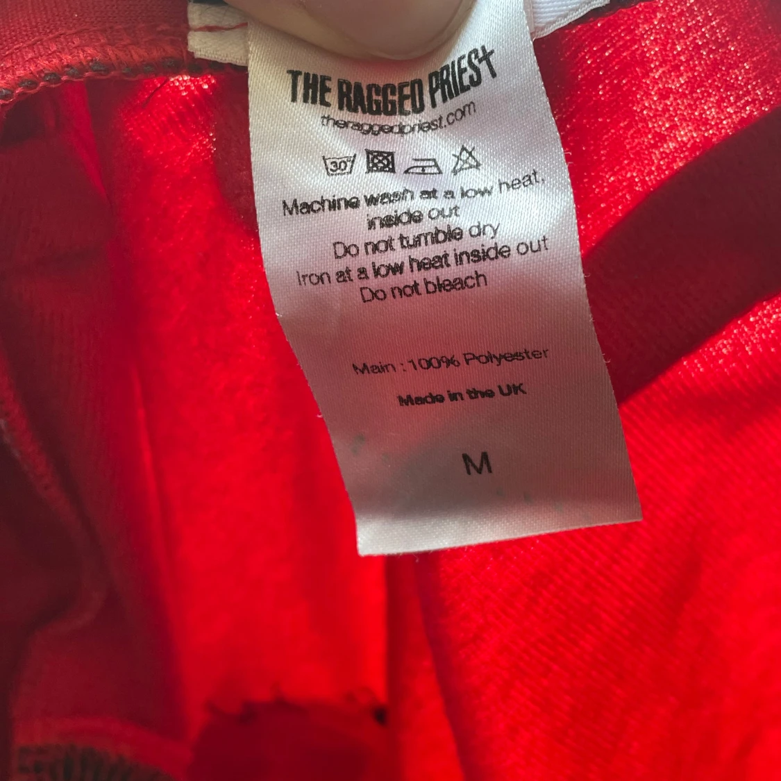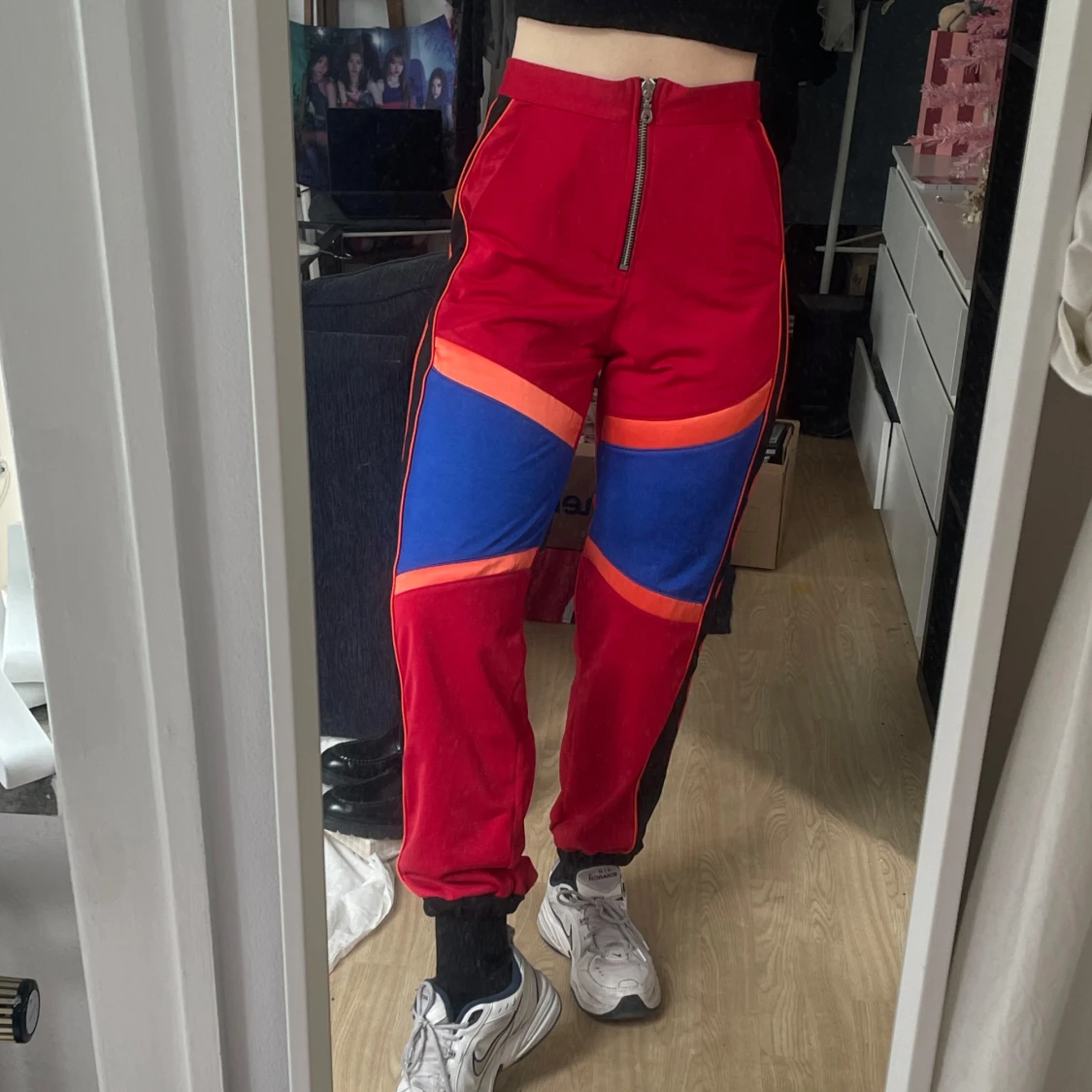 Unika byxor från The Ragged Priest i rött med svarta sidor, blå meshpaneler och orange detaljer. Byxorna har hög midja, dragkedja framtill och är gjorda i 100% polyester. Perfekta för dig som vill sticka ut med en färgstark och edgy stil. Storleken är mindre, passar S/M. Aldrig använda.