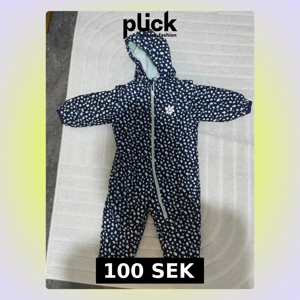 Mysig mörkblå täckoverall med vitt och ljusblått prickmönster. Overallen har huva, mjukt ljusblått foder och dragkedja framtill. Perfekt för kalla dagar och håller dig varm och bekväm. Snygg detalj med snöflinga på bröstet.