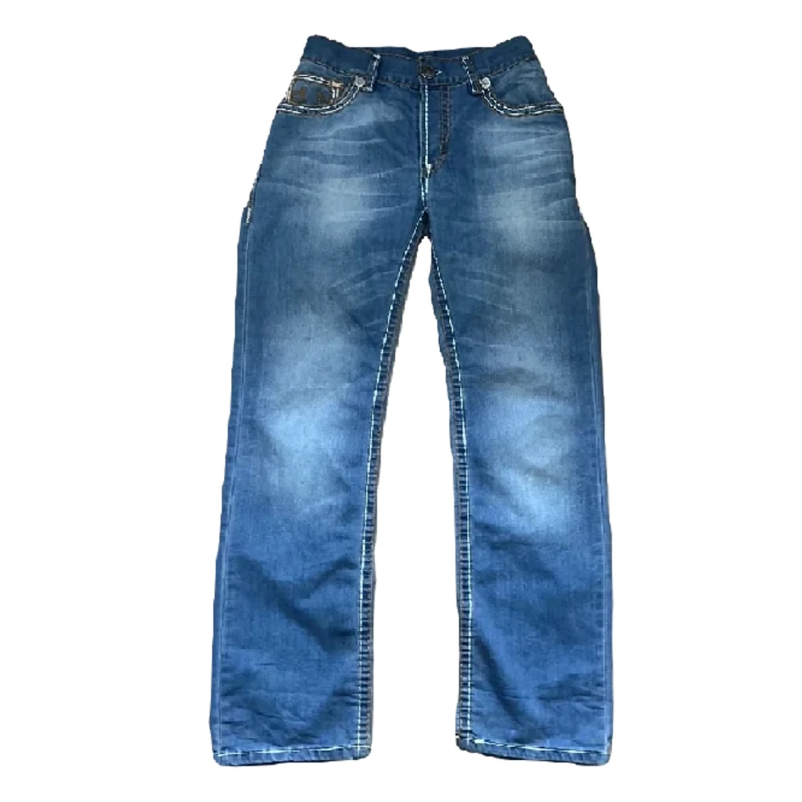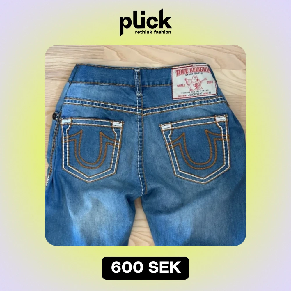 Supersnygga ljusblå true religion jeans! Storlek 36 (jeans-storlek, inte storlek S) men har sytts in, det går dock att sprätta upp då allt tyg är kvar. Nuvarande midjemått efter att ha sytts är 78 cm, innerbenslängden är ca 82 cm!
