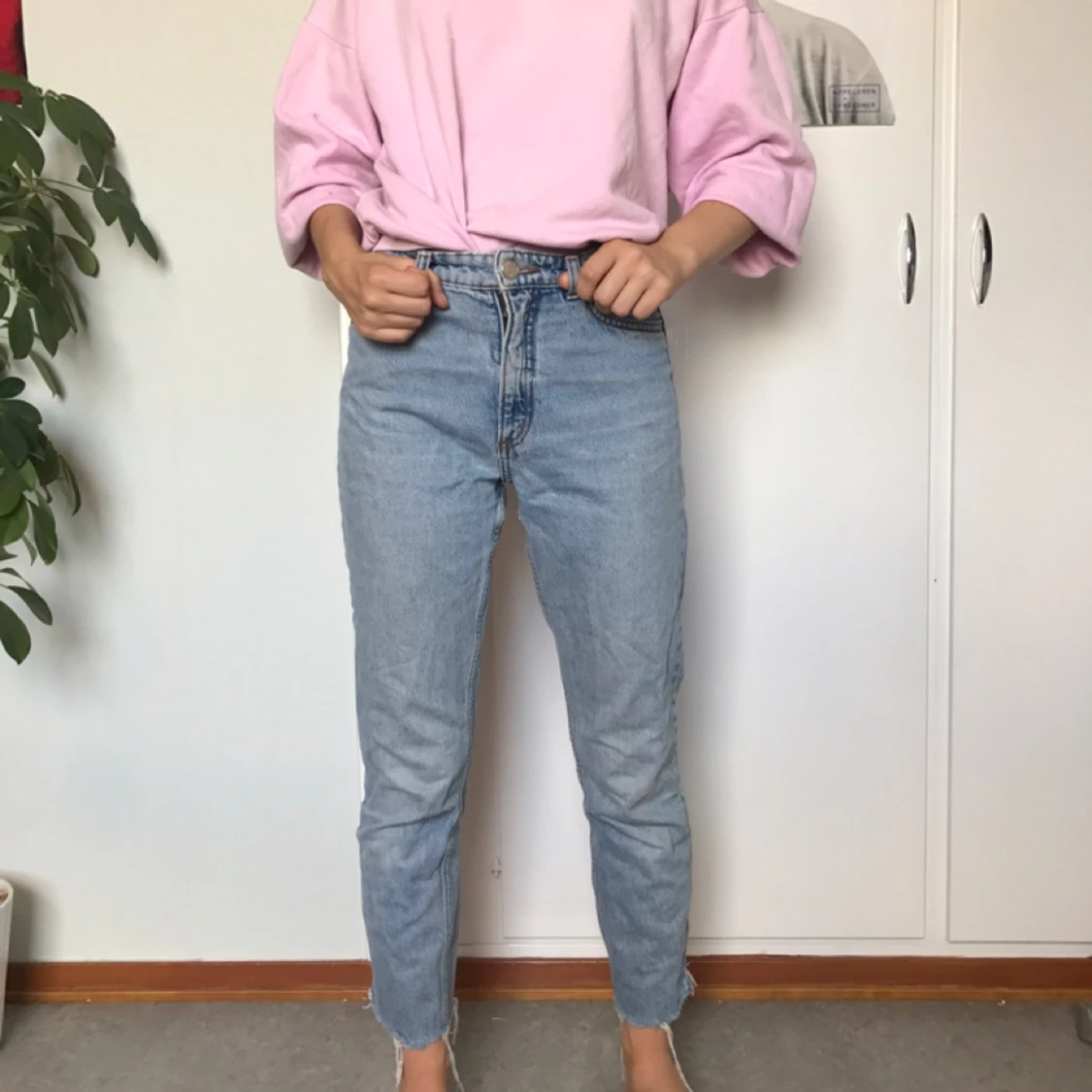 Perfekta 90tals jeans från Monki som jag själv klippt nere. Har en väldigt fin färg.