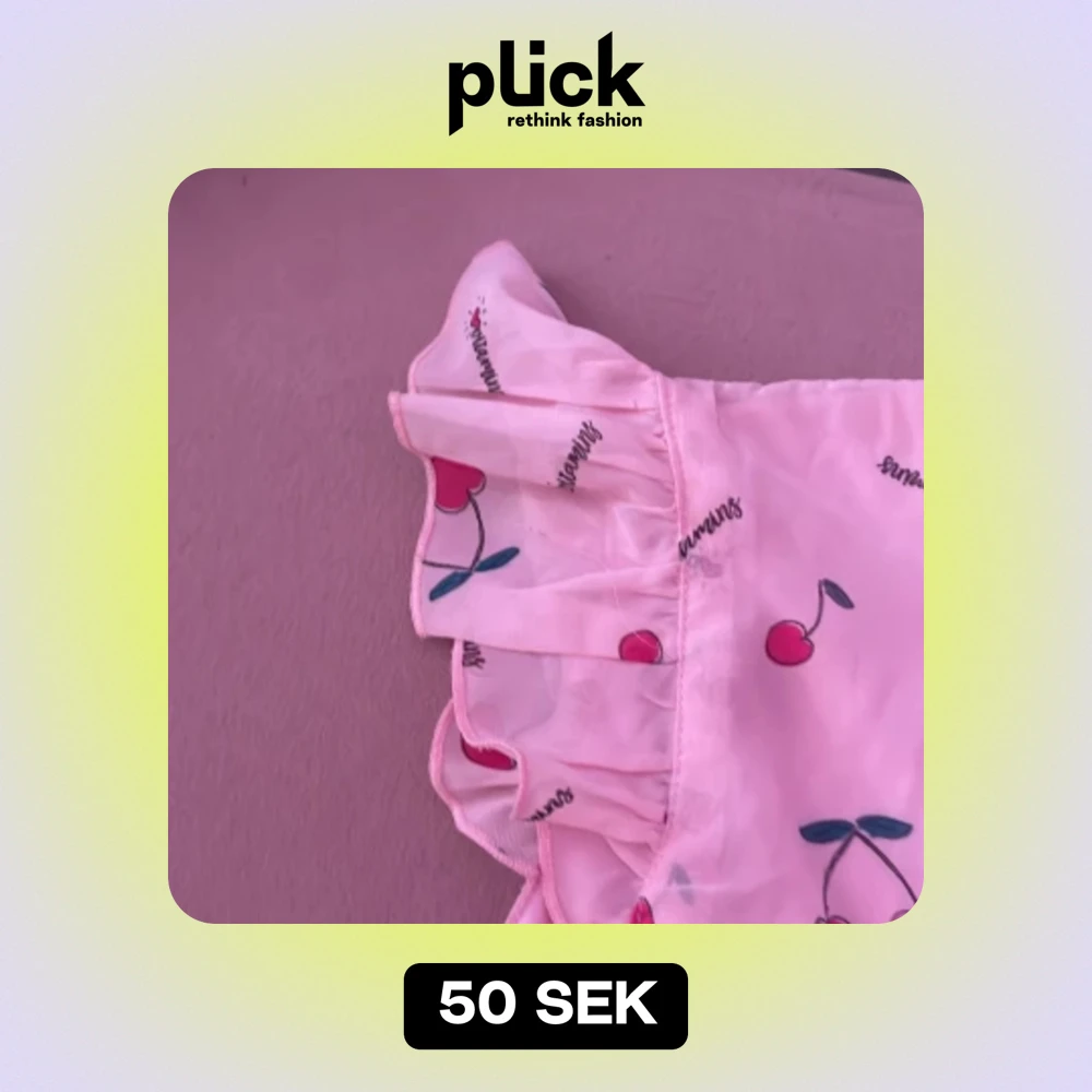 Den är rosa med körsbär på och den har volanger.