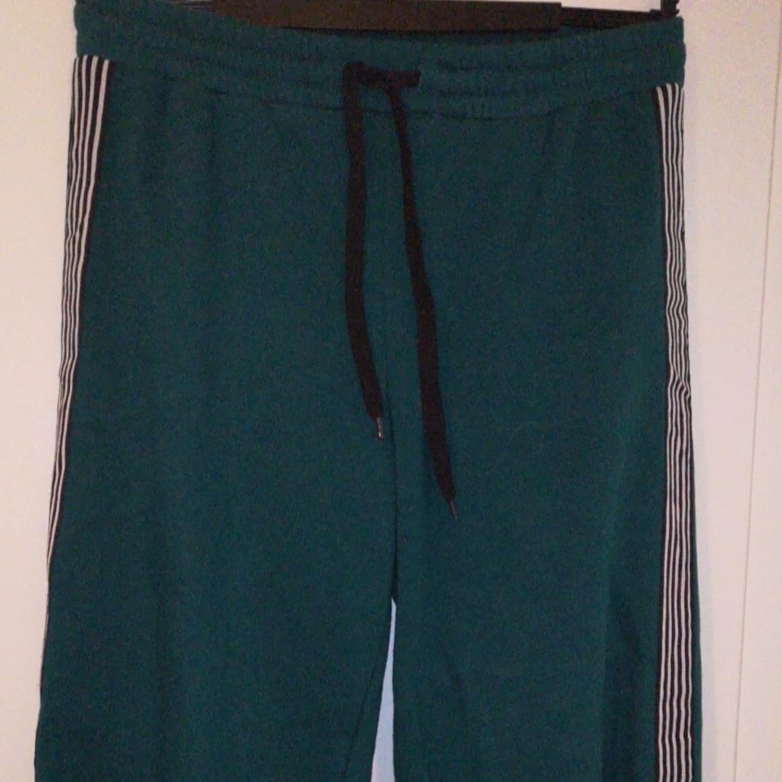Coola mörkgröna mjukisbyxor med streck på sidan Aldrig använda utanför huset Bra kvalitéer, varma Frakt betalas av köparen