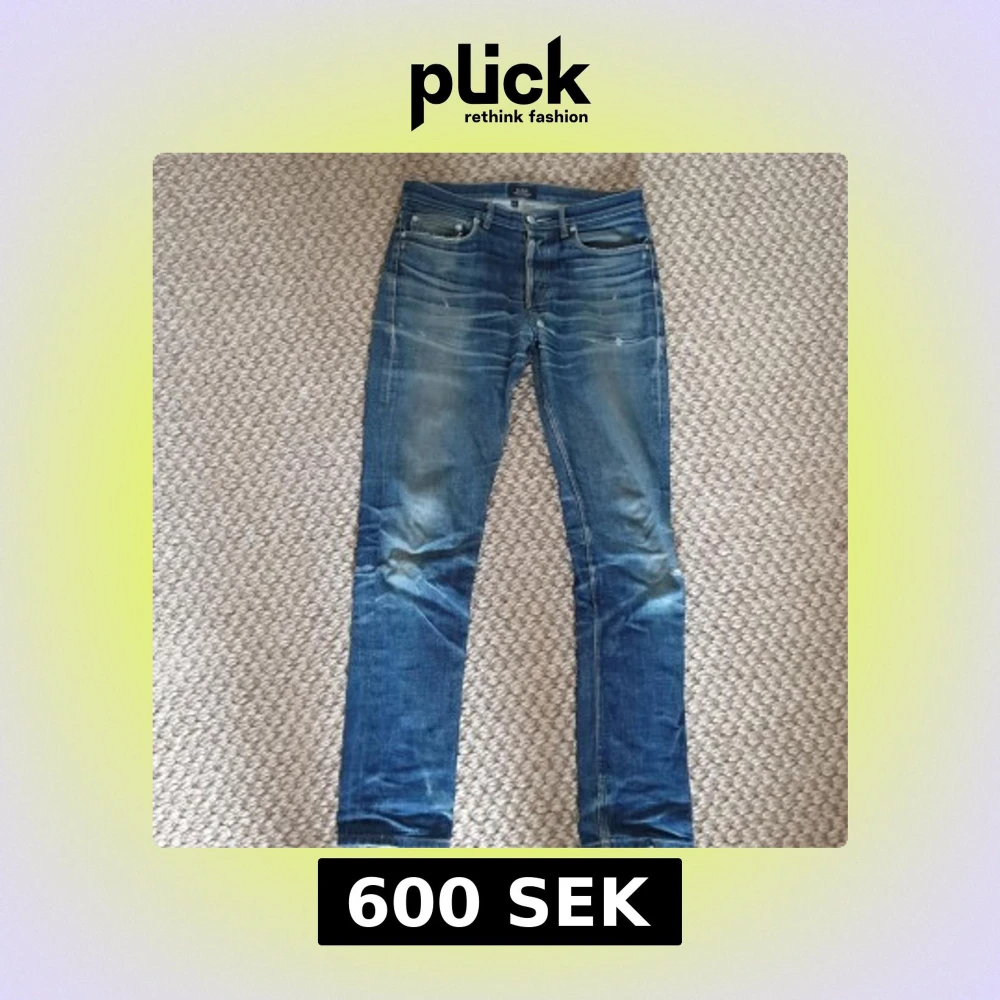 Säljer ett par klassiska A.P.C. New Standard jeans i blå tvätt med snyggt slitna detaljer och whiskers. Jeansen har rak passform, fem fickor och orange kontrastsömmar. Materialet är robust denim i bomull. Perfekta för dig som gillar en clean men avslappnad look.