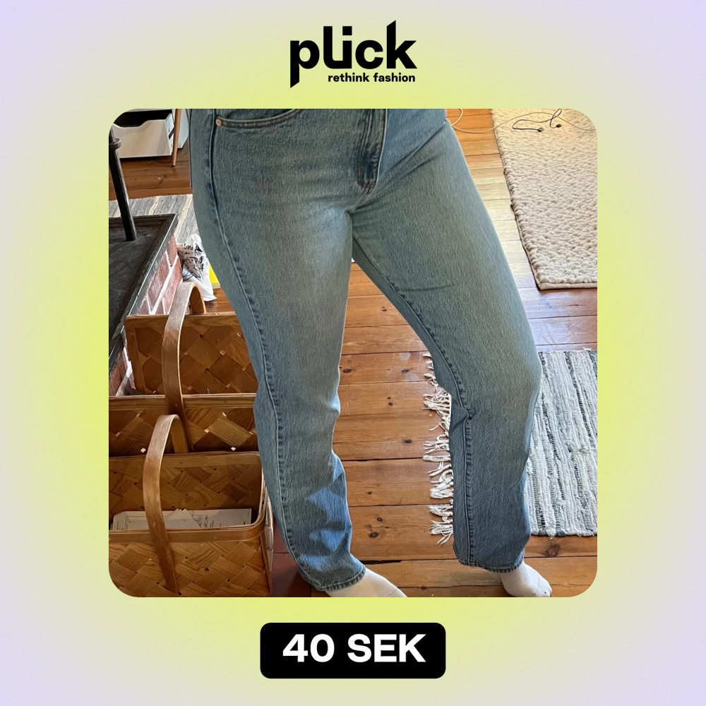 Jeans i modellen ”94 High straight från Abrand, i en blå tvätt som blivit ljusblå genom användning Storlek w27 Väldigt välanvända med slitningar i skrevet som har förstärkts med några sömmar men inget som drabbar funktion