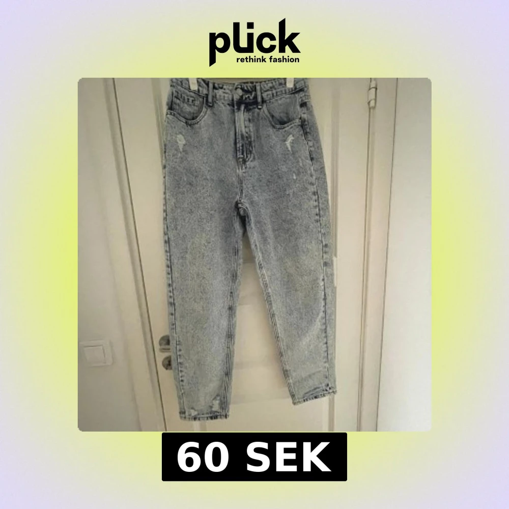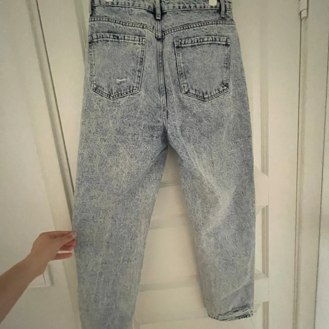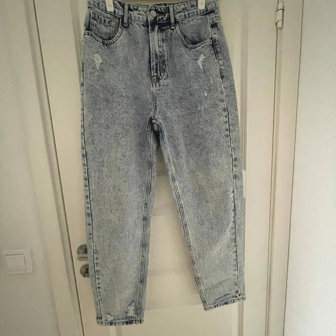 Snygga ljusblå acid wash mom jeans med hög midja och raka ben. Jeansen har klassiska fem fickor, bälteshällor och slitna detaljer framtill för en cool vintagekänsla. Perfekta för en avslappnad streetstyle-look.