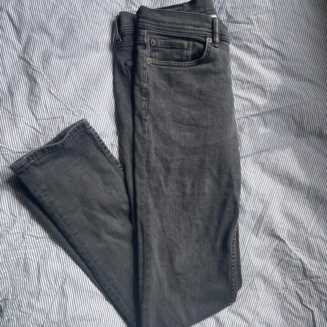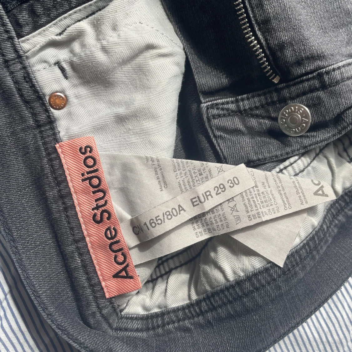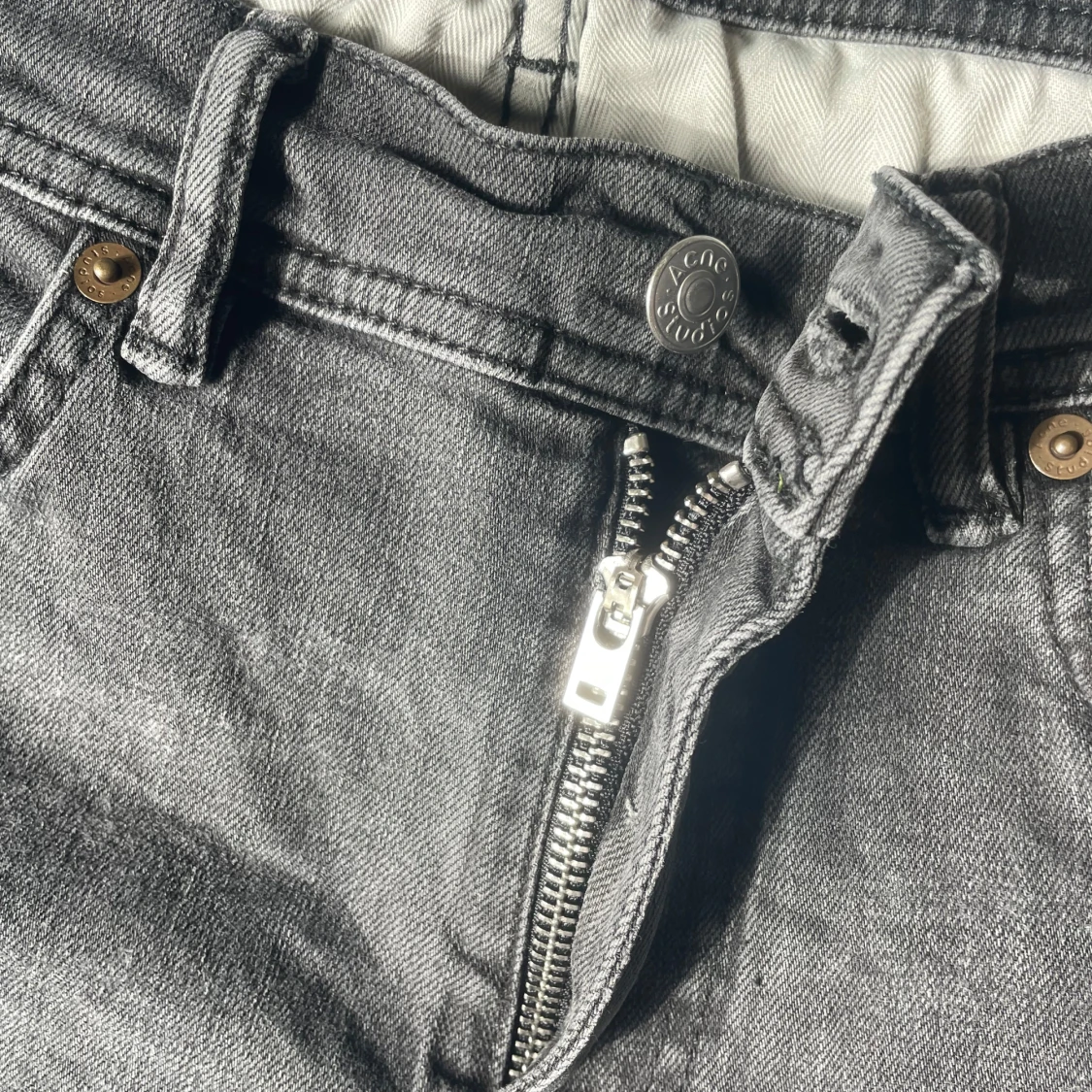 Snygga grå jeans från Acne Studios i klassisk femficksmodell. Jeansen har dragkedja, raka ben och normal passform. Materialet är mjukt denim i bomull och de har diskreta detaljer i silver vid knappar och dragkedja. Perfekt för dig som gillar stilrena och tidlösa jeans.