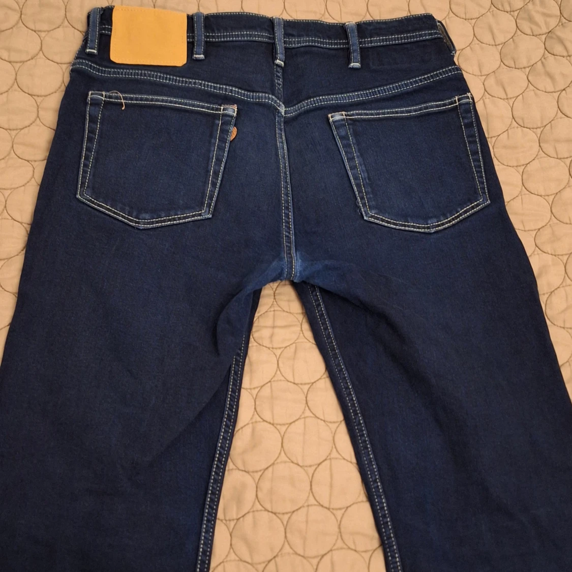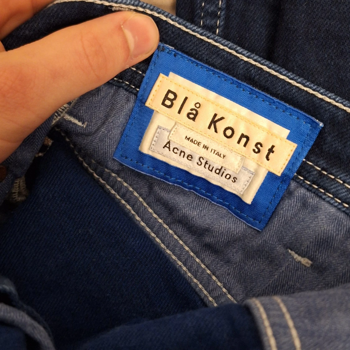 Snygga blå jeans från Acne Studios Blå Konst. Klassisk design med fem fickor och kontrastsömmar. Perfekta för en stilren look. Se sista bild för defekt