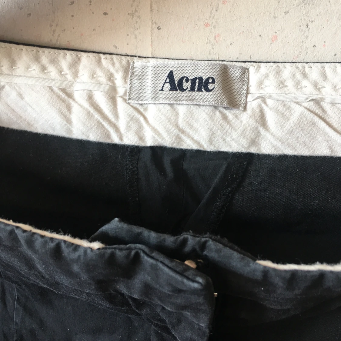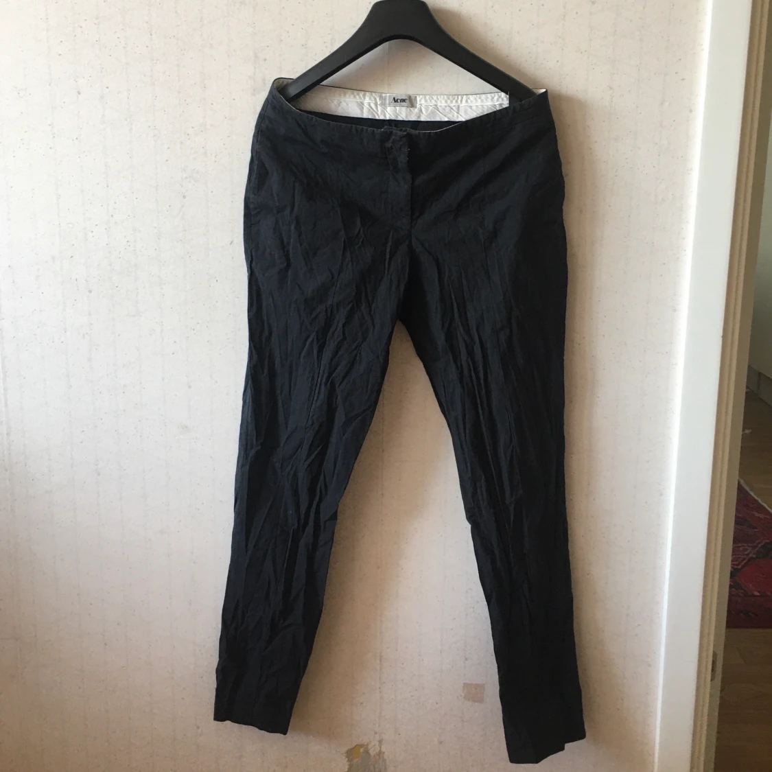 Smala kostymbyxor från Acne. Använt med bra skick, skrynkliga för de legat i en låda, strl 34. 95% bomull & 5% elastan, jättebekväma. Sydda pressväck, fickor fram och dolda fickor bak. Kommer bli superfina när de får bli strykta! Köper betalar frakt.