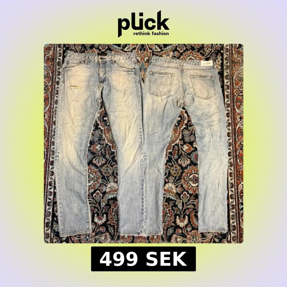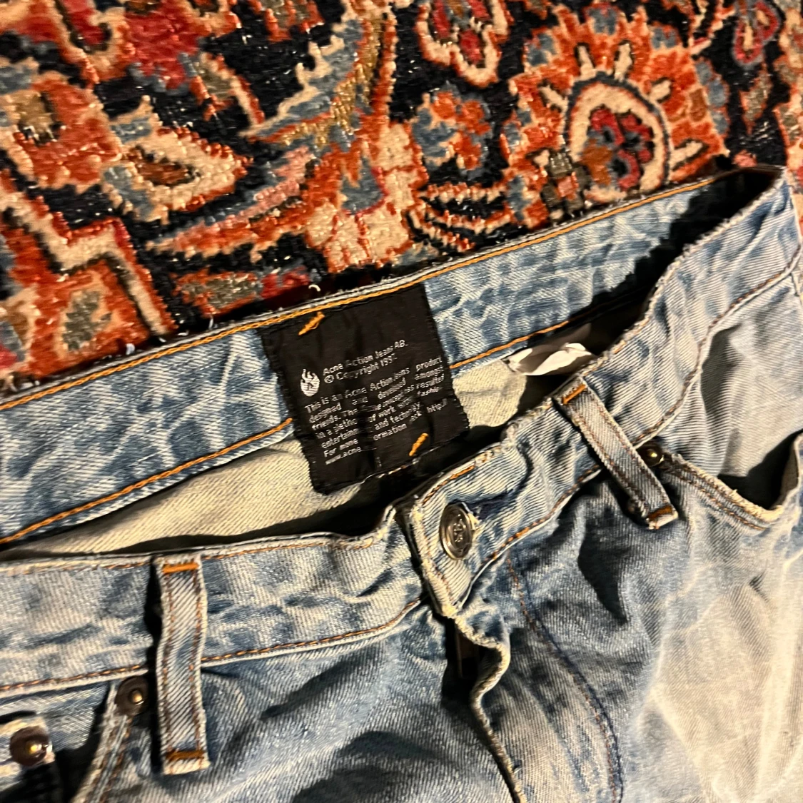 Sjukt snygga acne action jeans, acne action är en av acnes äldsta kollektioner någonsin alltså är dessa jeans hyfsat rare. De har professionella lagningar i skrevet men dem syns inte särkilt mycket passformen är en slim/straight passform. Mått: Midja: 42cm Längd: 103cm Benöppning: 16,50cm