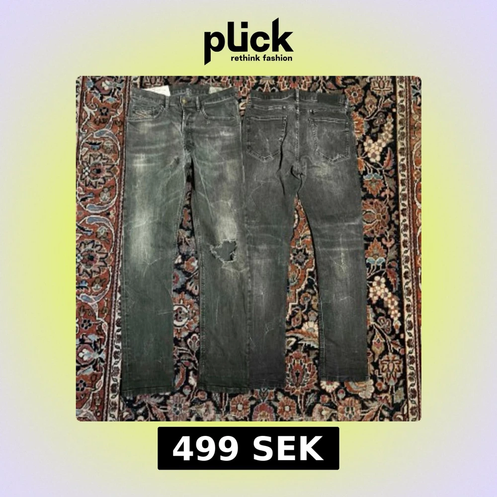 Sjukt snygga grå/svarta diesel jeans! Dem har en unik tvätt och en slitning vid knät de är modellen ”D-EETAR” Mått: Midja: 39cm Längd: 99cm Benöppning: 16cm