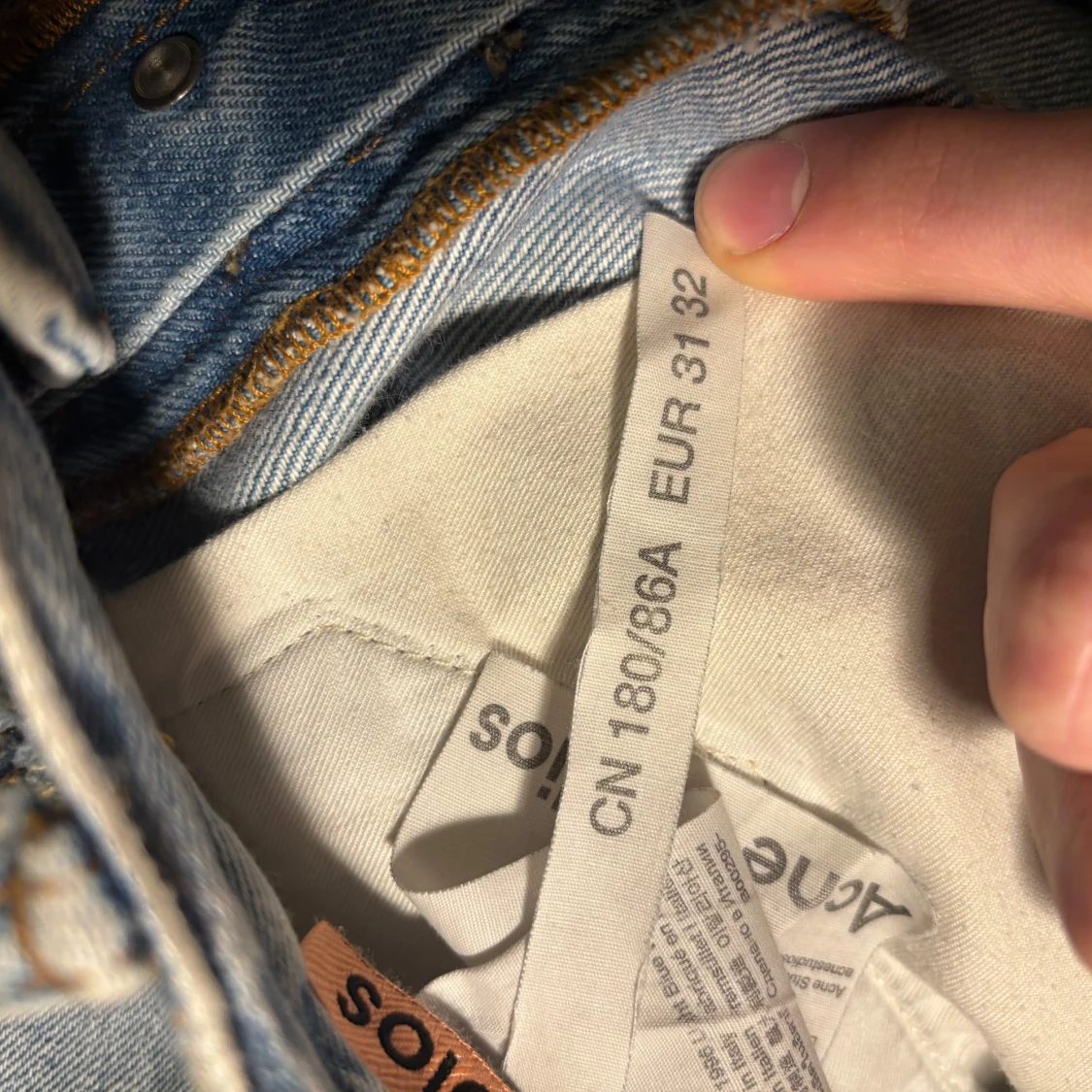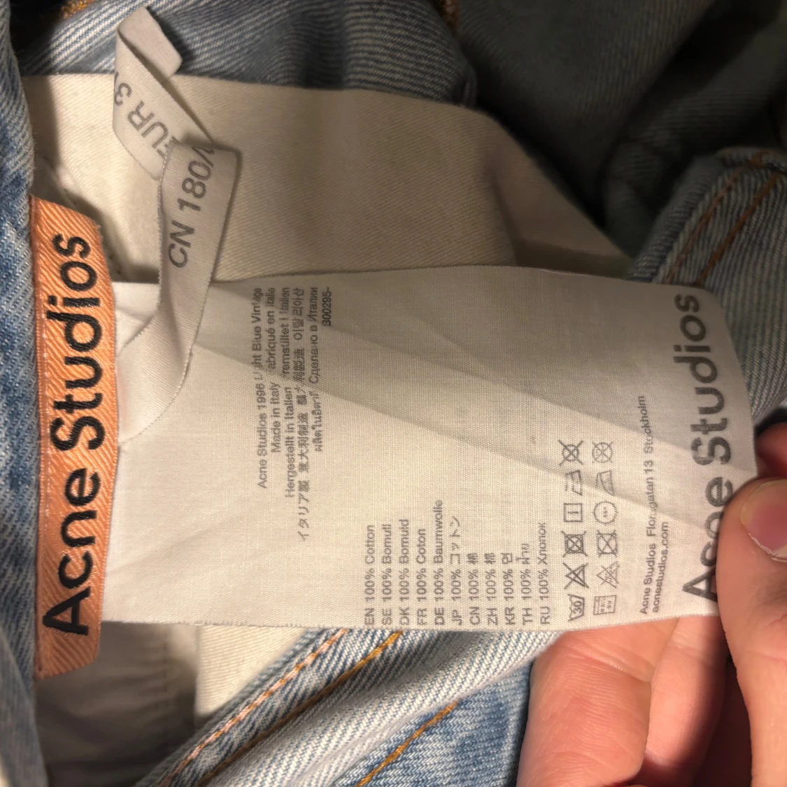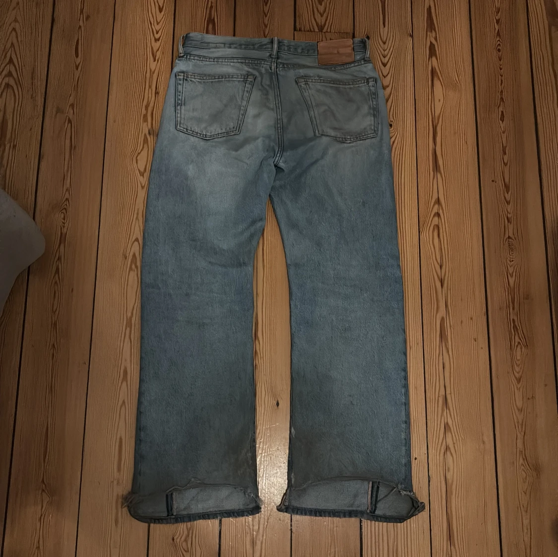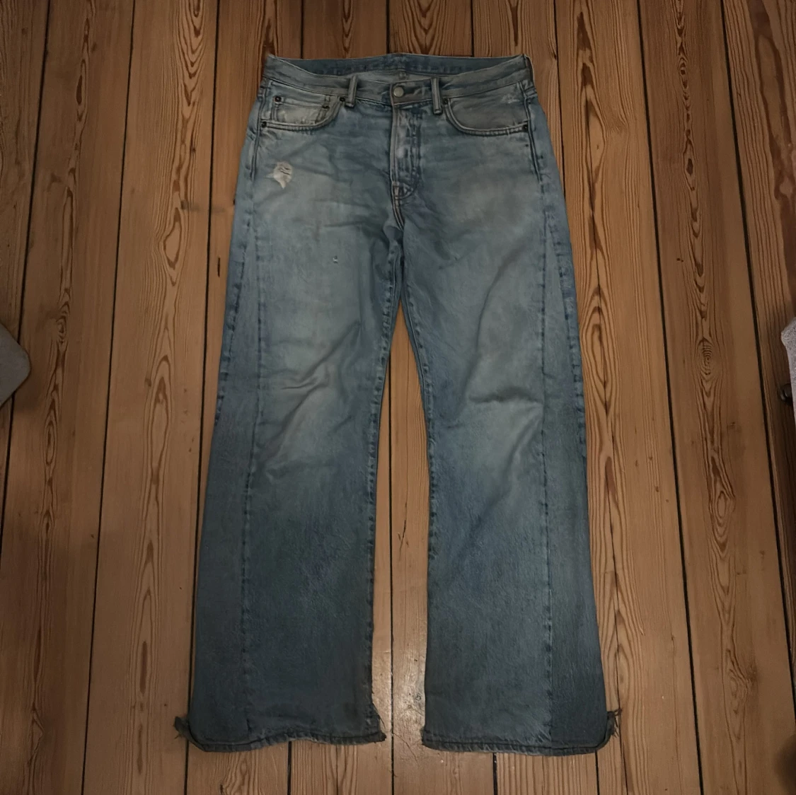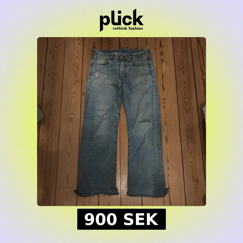 Säljer blåa acne jeans, modellen e 1996 men har sytt upp de så de är mer loose, waist:42 benöppning e 27 o ytterbenslängd är ca 102.