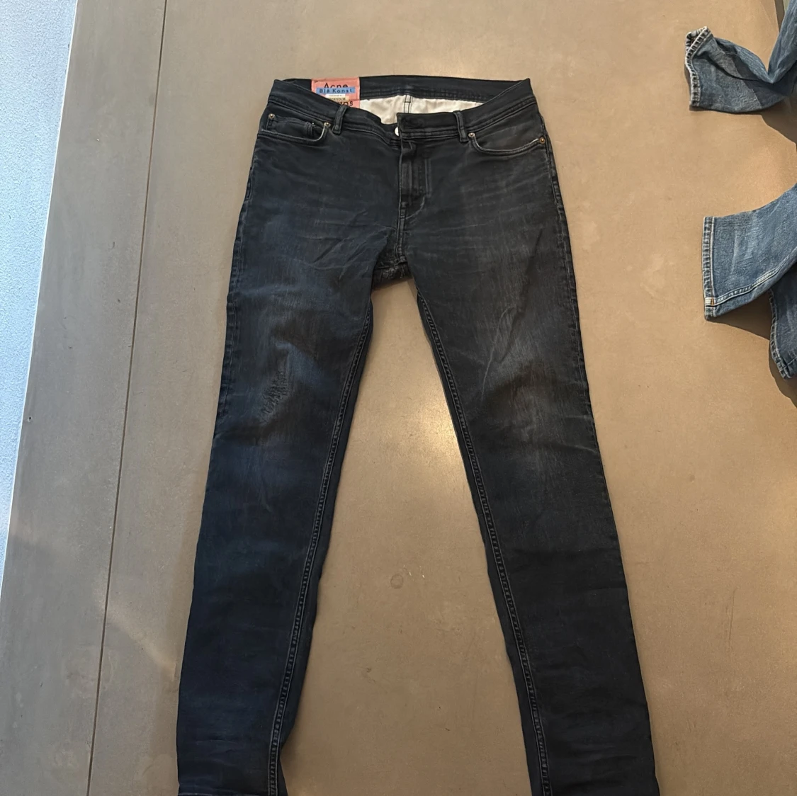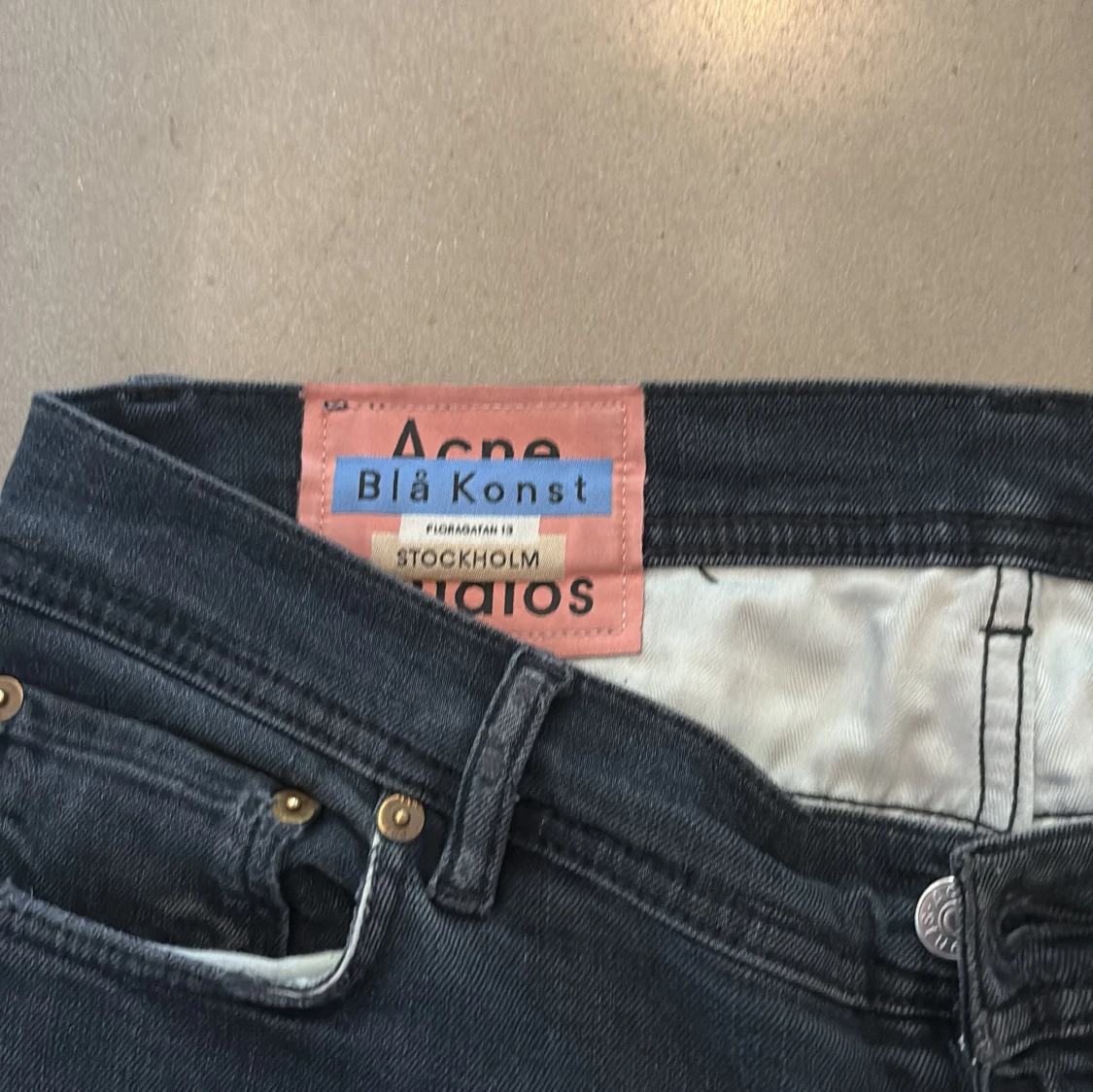 Snygga svarta jeans från Acne Studios Blå Konst med klassisk femficksdesign och diskreta slitningar. Jeansen är i strl 33 och i fint skick, jeansen är lagade i grenen👍