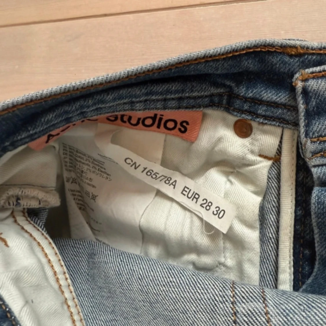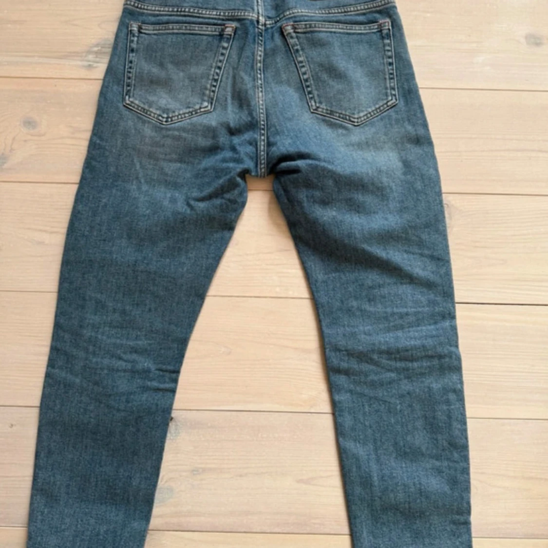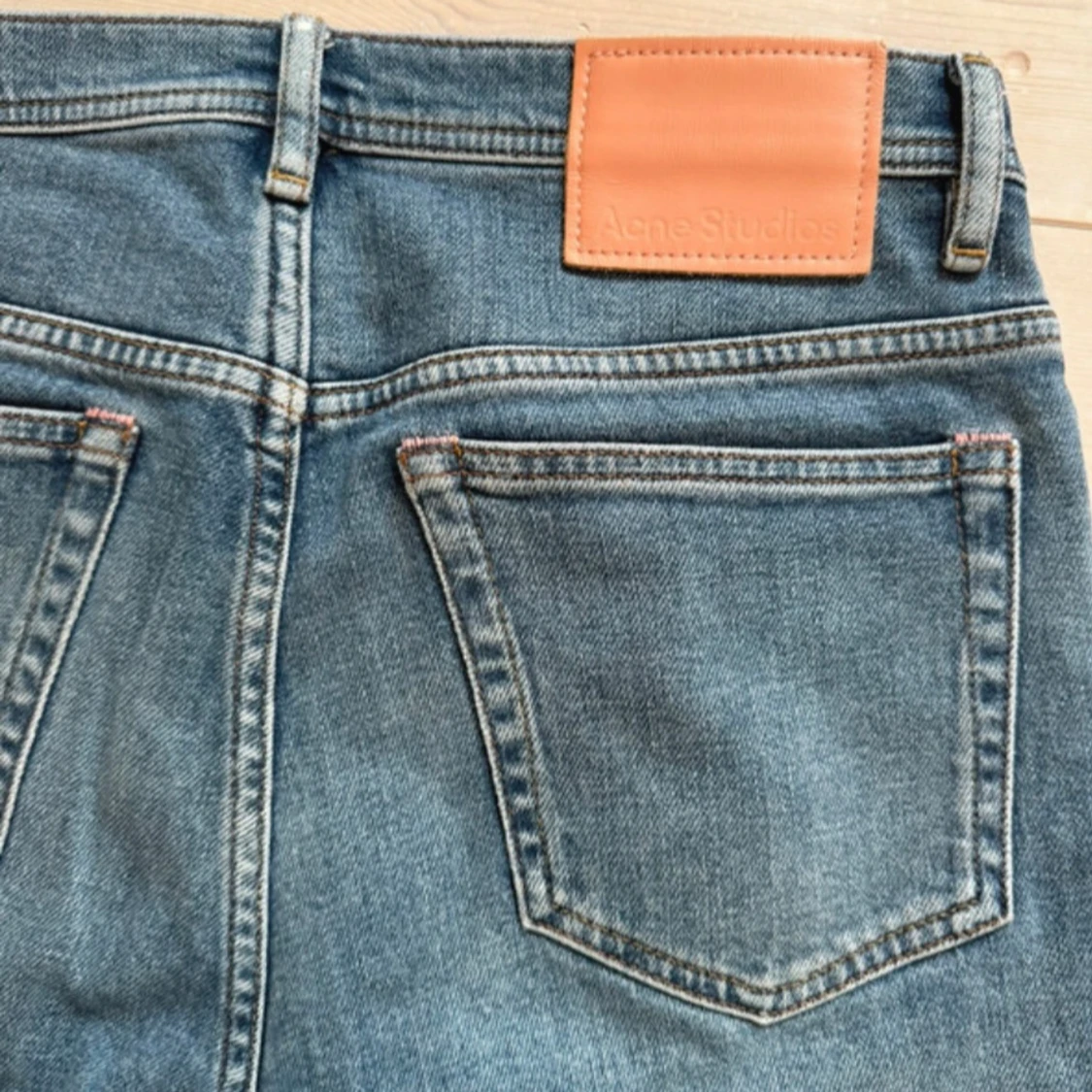Säljer ett par klassiska blå jeans från Acne Studios med fem fickor och raka ben. Jeansen har normal passform och är tillverkade i denim med snygga slitningar framtill. Perfekta för en stilren och avslappnad look.