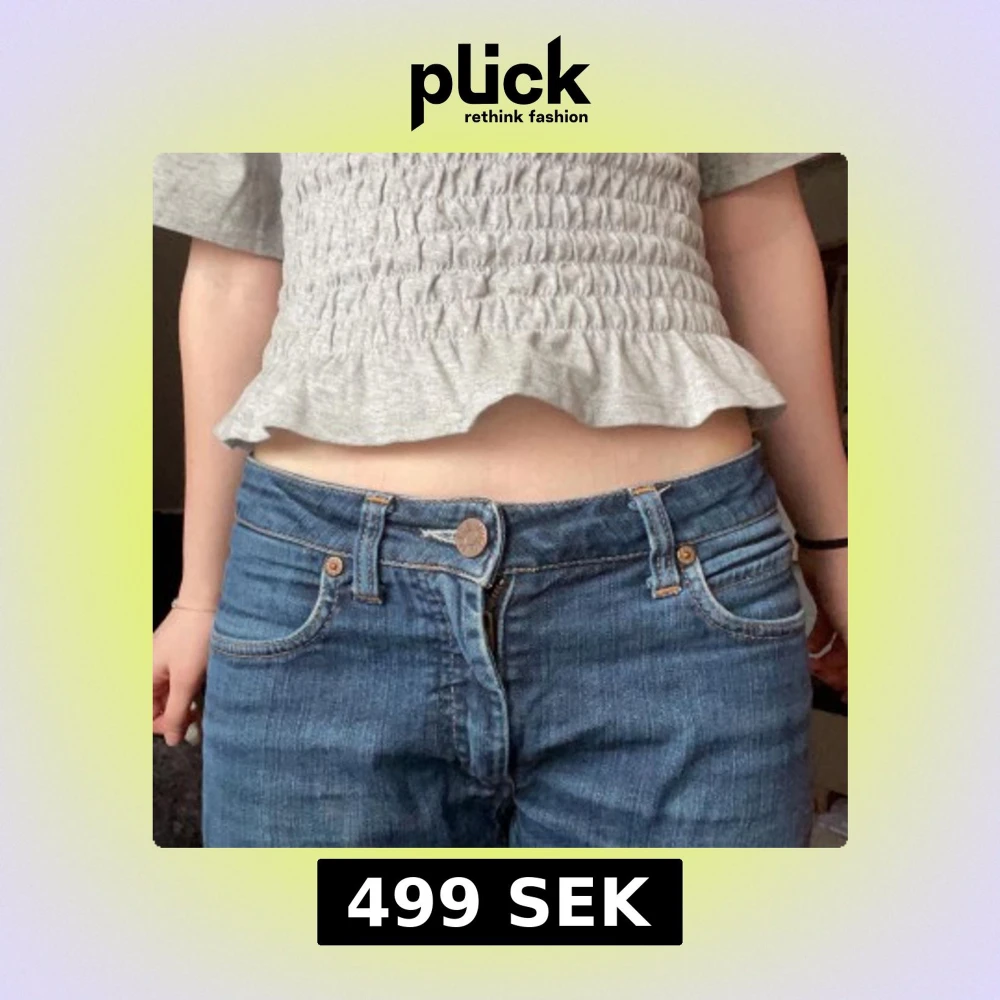 Snygga lågmidjadeblå jeans från Acne med klassisk femficksdesign och knappgylf. De har en ganska så rak bootcutpassform och är perfekta för en avslappnad stil. Märkeslappen syns tydligt på baksidan.