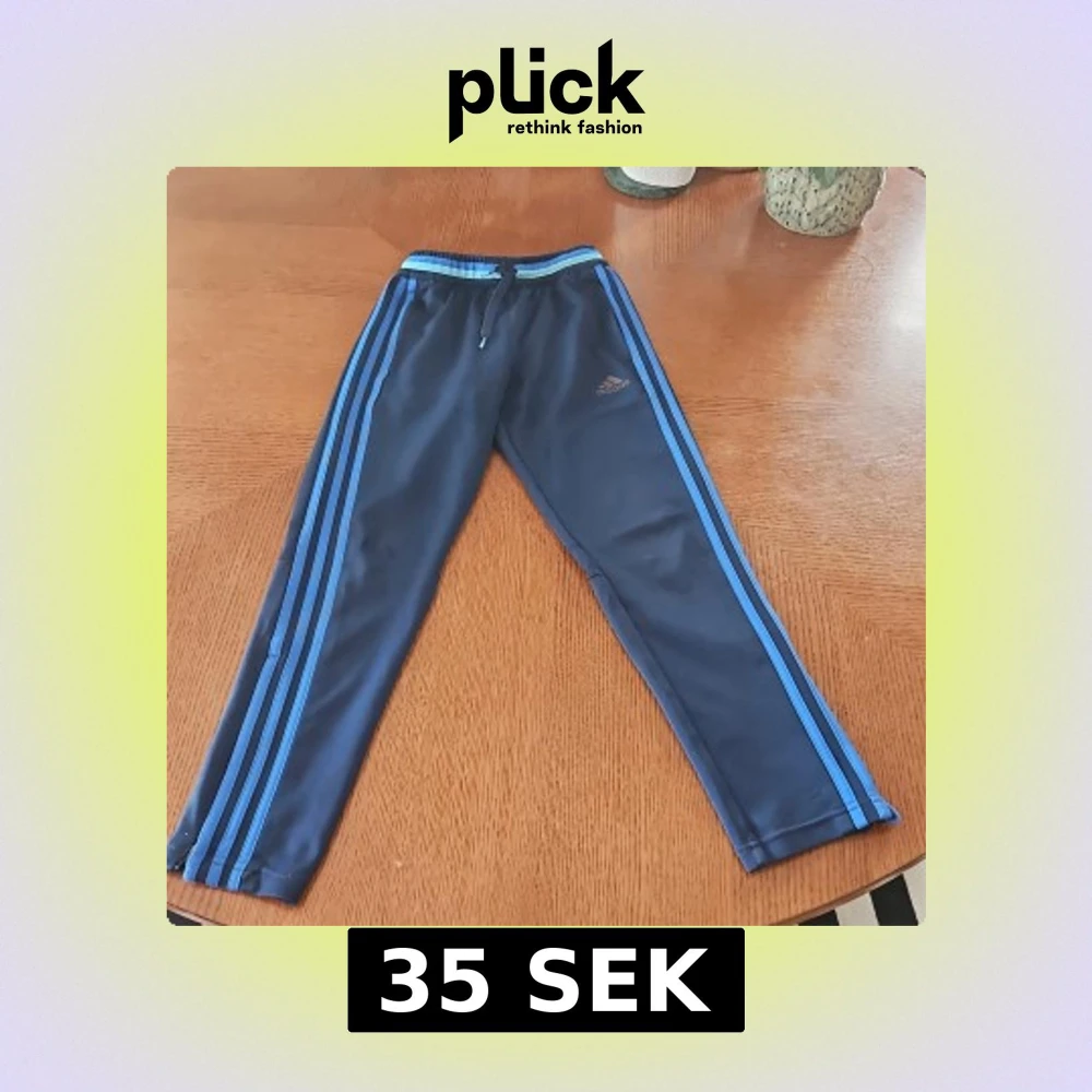 Mörkblå träningsbyxor från Adidas med ljusblå ränder längs benen och snörning i midjan. Klassisk Adidas-logga på låret och elastisk midja. Perfekta för sport eller chill. Tillverkade i polyester för skön passform.