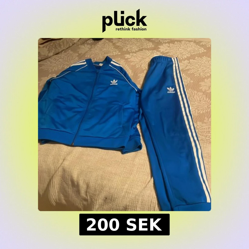 Säljer ett par klassiska blå Adidas träningsbyxor med vita ränder längs sidorna och Adidas-logga på låret. Byxorna har elastisk midja och är perfekta för sport eller chill. Matchar med tillhörande jacka om du vill köra hela looken.