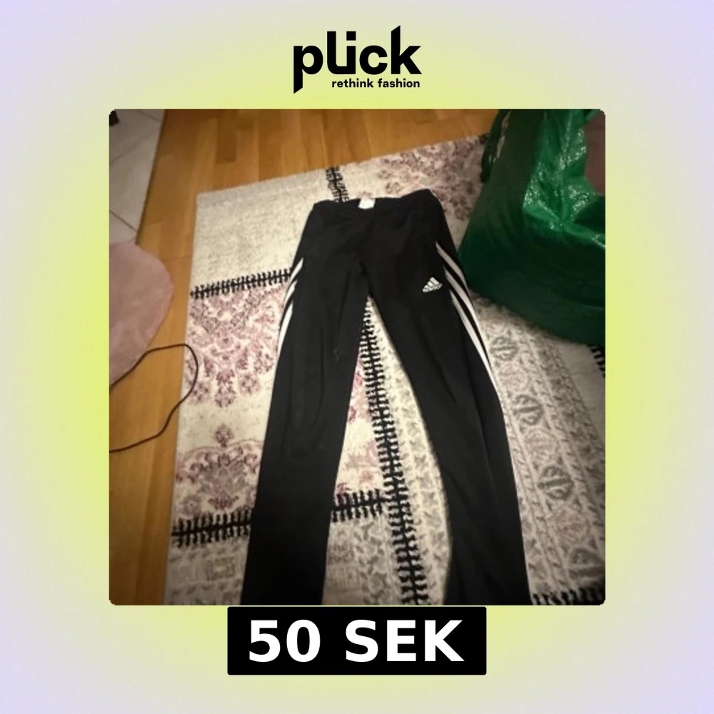 Säljer ett par svarta träningsbyxor från Adidas med vita detaljer och logga på sidan. Byxorna har en elastisk midja och är perfekta för sport och träning. De är tillverkade i ett lätt och bekvämt material.
