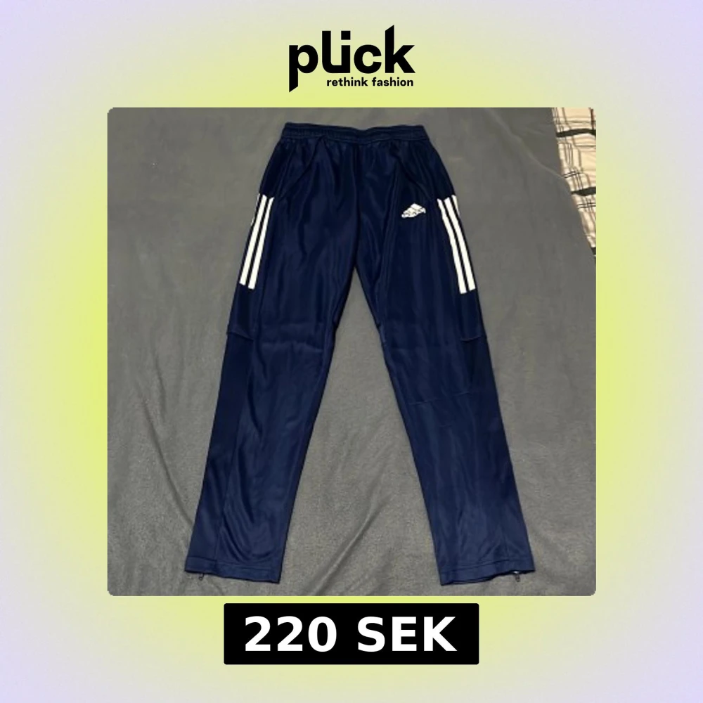 Snygga mörkblå träningsbyxor från Adidas med vita ränder längs sidorna och logga på framsidan. Byxorna har elastisk midja, dragkedjor vid fickor och benslut samt är gjorda i ett glansigt syntetmaterial. Perfekta för sport eller chill.