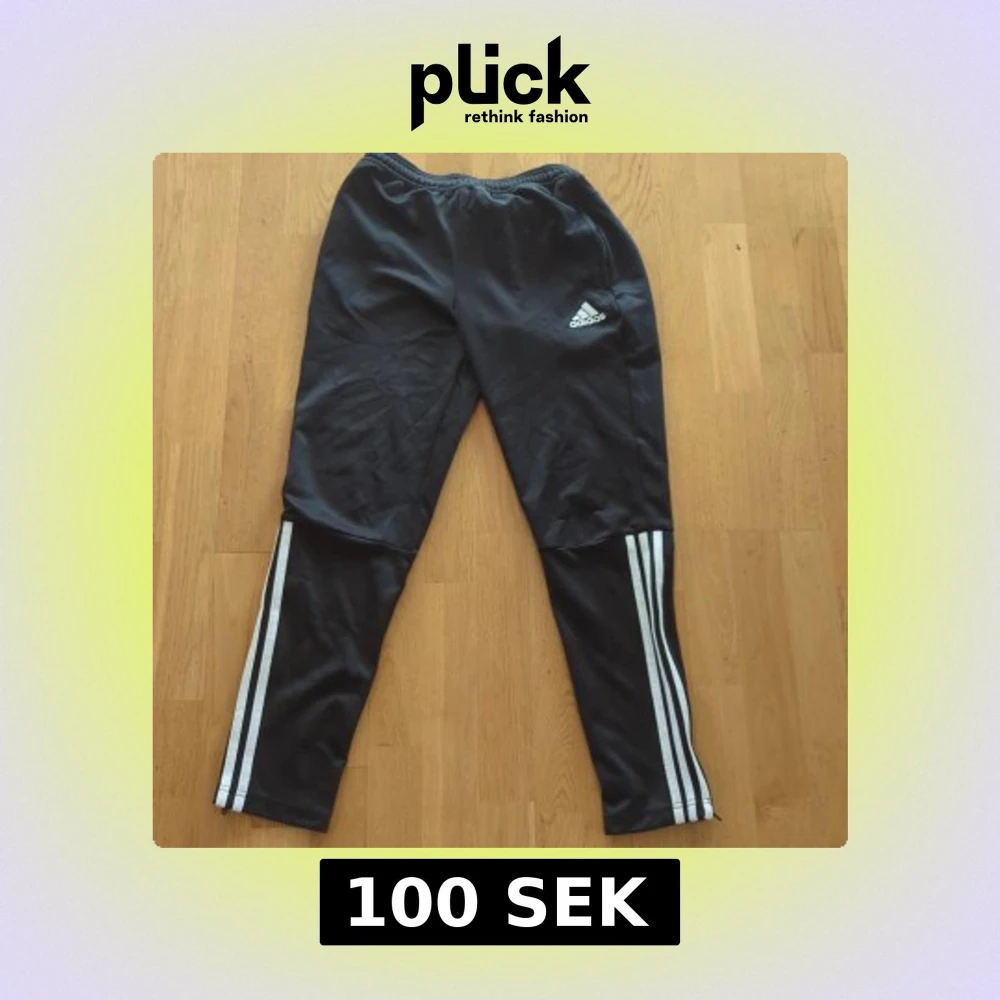 Svarta träningsbyxor från Adidas med klassiska vita ränder längs benen och Adidas-logga på låret. Byxorna har elastisk midja och är tillverkade i ett syntetmaterial som passar perfekt för sport och träning.