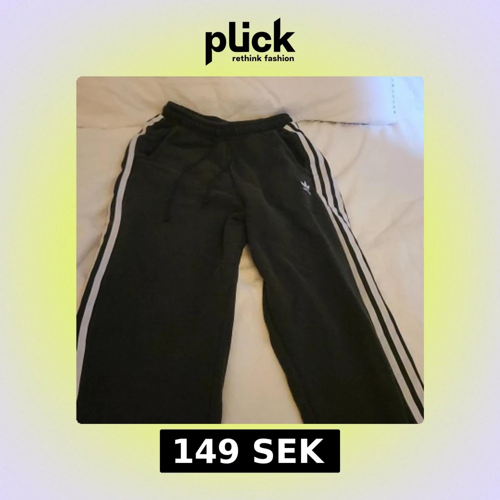 Svarta mjukisbyxor från Adidas med klassiska vita ränder längs sidorna och broderad logga på låret. Byxorna har resår och snörning i midjan samt bekväma sidofickor. Perfekta för chill eller sportig stil.