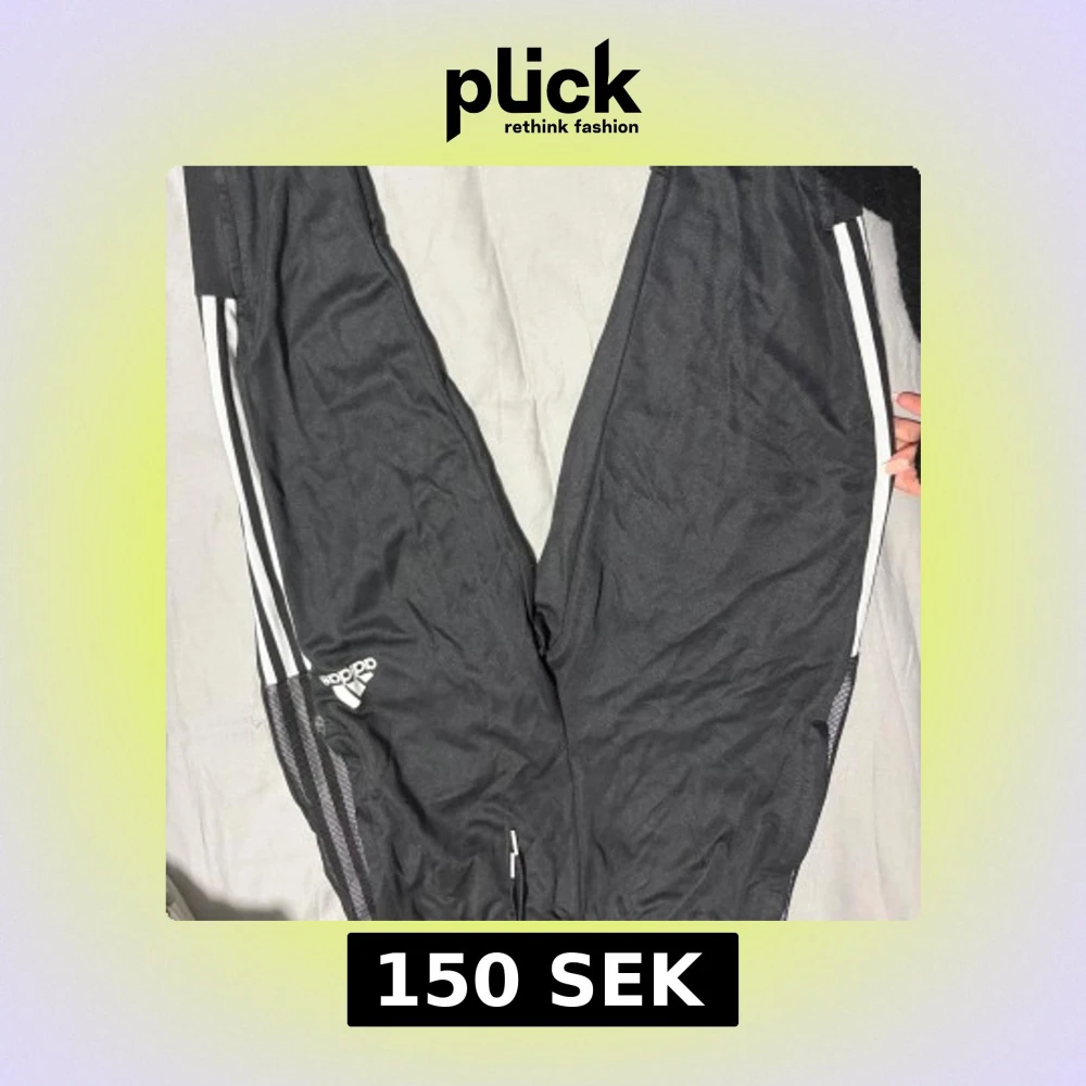 Svarta träningsbyxor från Adidas med klassiska vita ränder längs sidorna och Adidas-logga på benet. Byxorna har elastisk midja och mesh-detaljer vid vaden för extra ventilation. Perfekta för sport eller chill. Använt 1 gång då jag spelade fotboll med några vänner, priset kan diskuteras.
