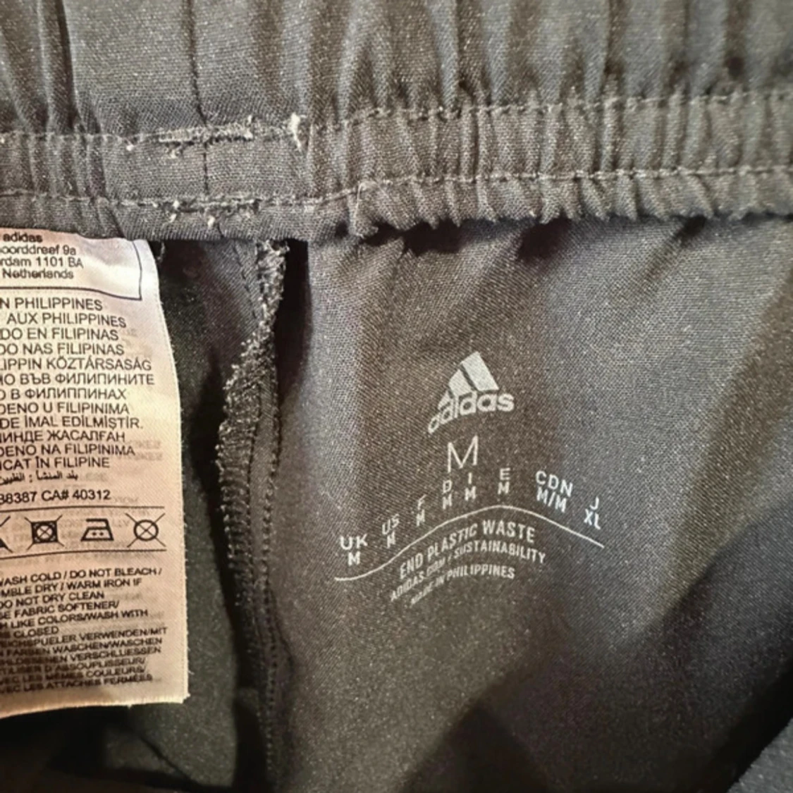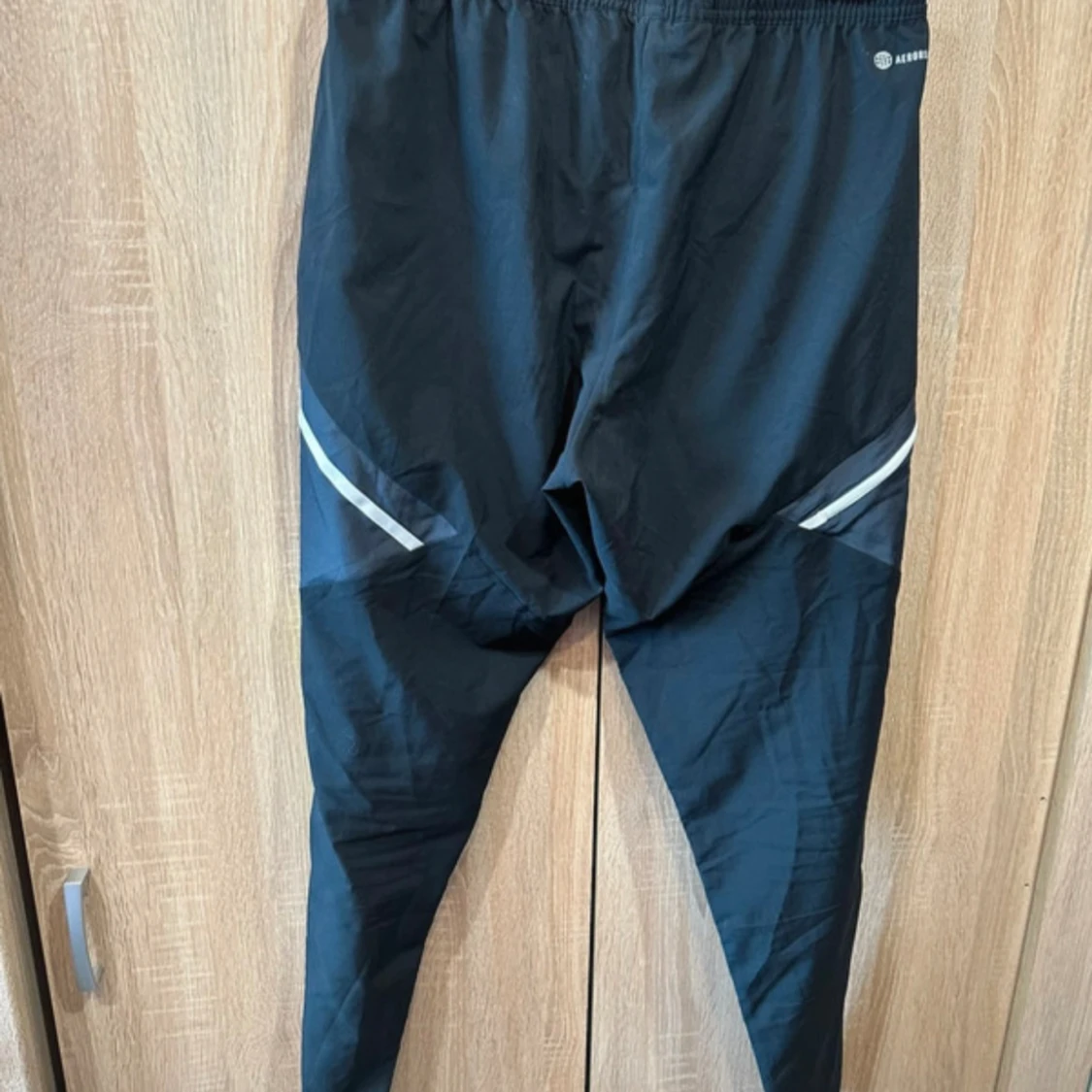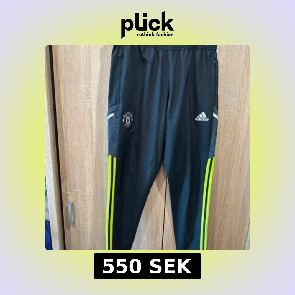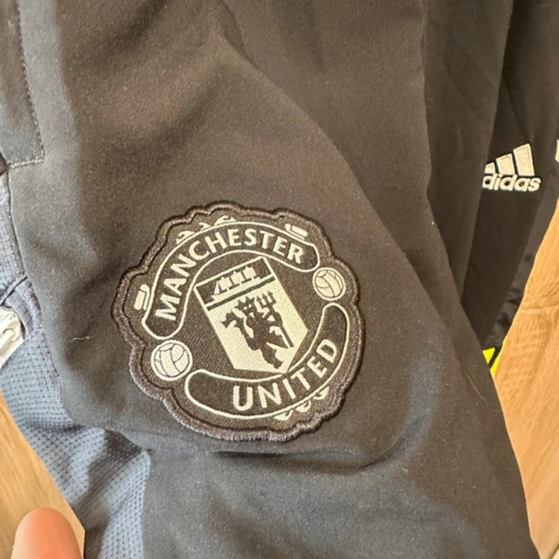 Svarta träningsbyxor från Adidas med Manchester United-logga på benet och neongula ränder längs sidorna. Byxorna har elastisk midja, dragkedjor vid fickorna och reflekterande detaljer baktill. Perfekta för fotboll eller träning.