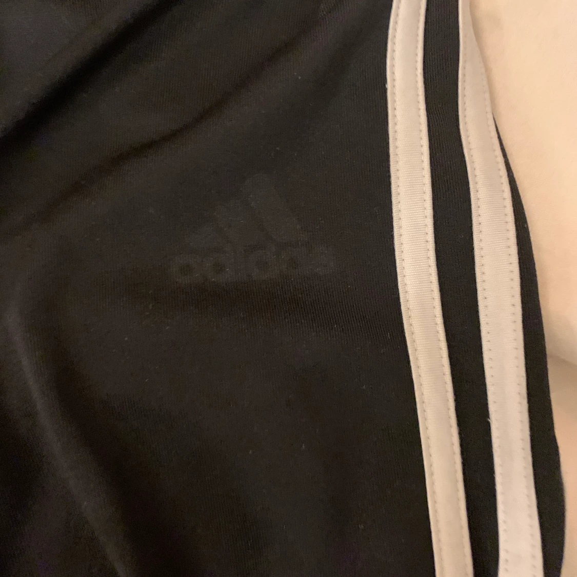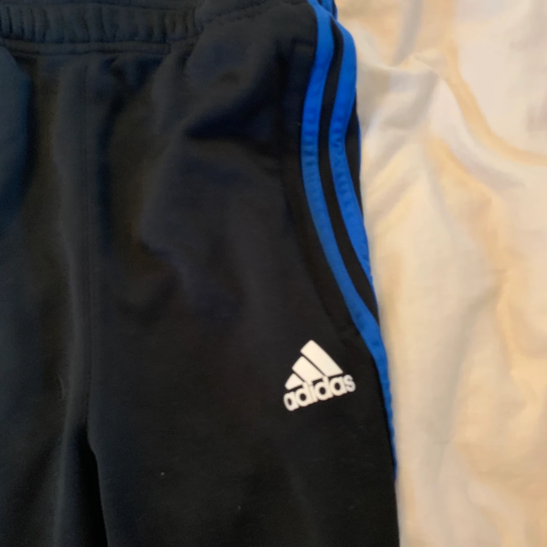 Adidasbyxor med blåa stripes och dragkedja nertill även luftande material nertill storlek xxs Väldigt fint skick. Adidasbyxor med vita stripes storlek xxs i fint skick förutom att loggan har lossnat😕 köparen står för frakten (66kr)☺️ nypris för allt är 600kr, mitt pris för allt inklusive frakt är 86kr