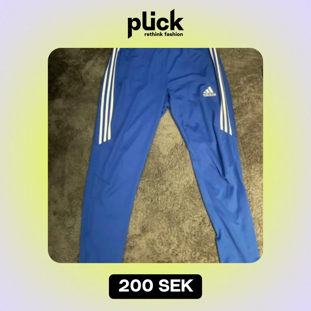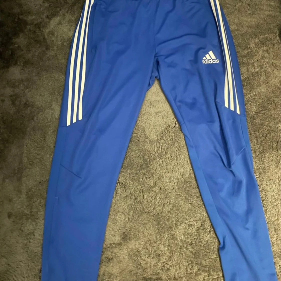 Blå träningsbyxor från Adidas med vita ränder längs sidorna och Adidas-logotyp på ena benet. Byxorna är tillverkade i ett lätt och bekvämt material.