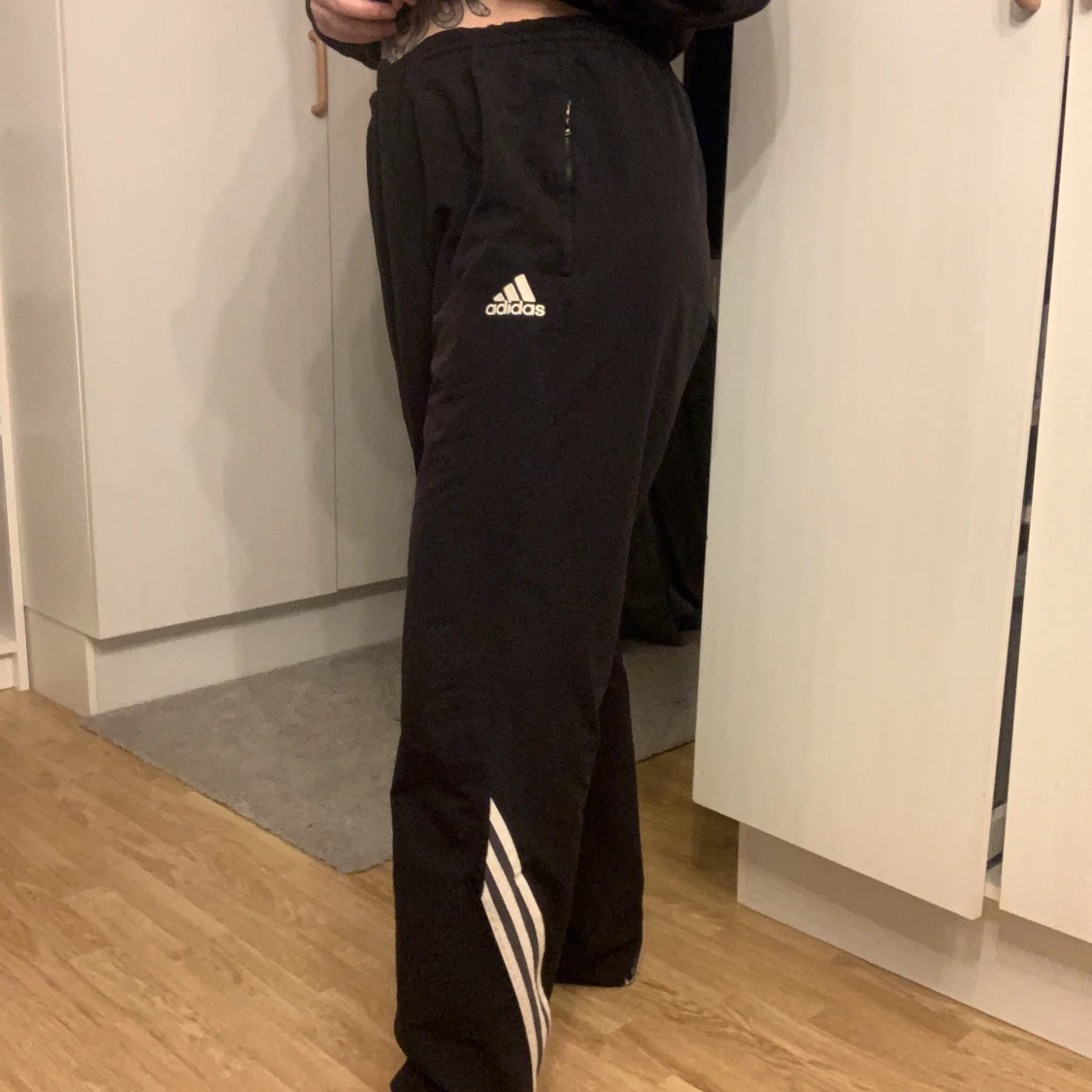 Adidas byxor ”tracksuit” material. Finns inga lappar kvar men uppskattar till stl XL Midjemått rakt över: 50cm. Längd: ca 107 cm (passat mig som är 167cm) Resårband invändigt så byxan går att spänna åt