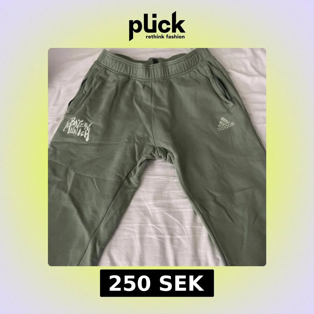 Gröna mjukisbyxor från Adidas med Bayern München-brodyr på ena benet. Byxorna har resår i midjan, snörning och dragkedjeförsedda fickor. Tillverkade i mjuk bomullsmix för skön känsla och avslappnad stil.