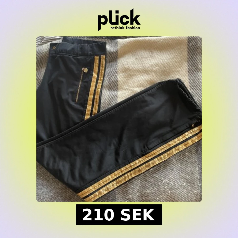 Skit snygga lågmidjade strait legged byxor. Sitter tight men bekvämt upptill och svänger i benen. Långa ben med guld ränder längst sidan. Passar för träning och annat.