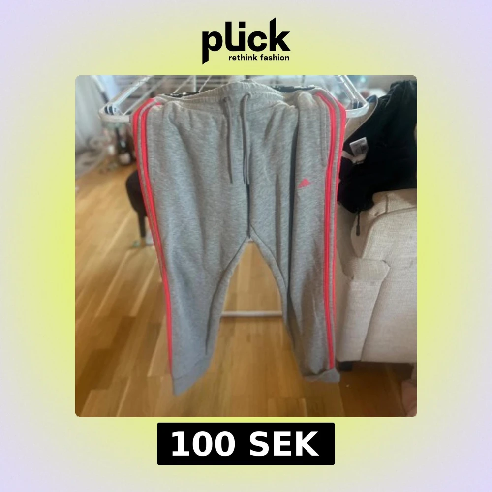 Grå mjukisbyxor från Adidas med rosa ränder längs sidorna och rosa Adidas-logga på låret. Byxorna har dragsko i midjan och raka ben. Perfekta för en sportig och avslappnad stil.