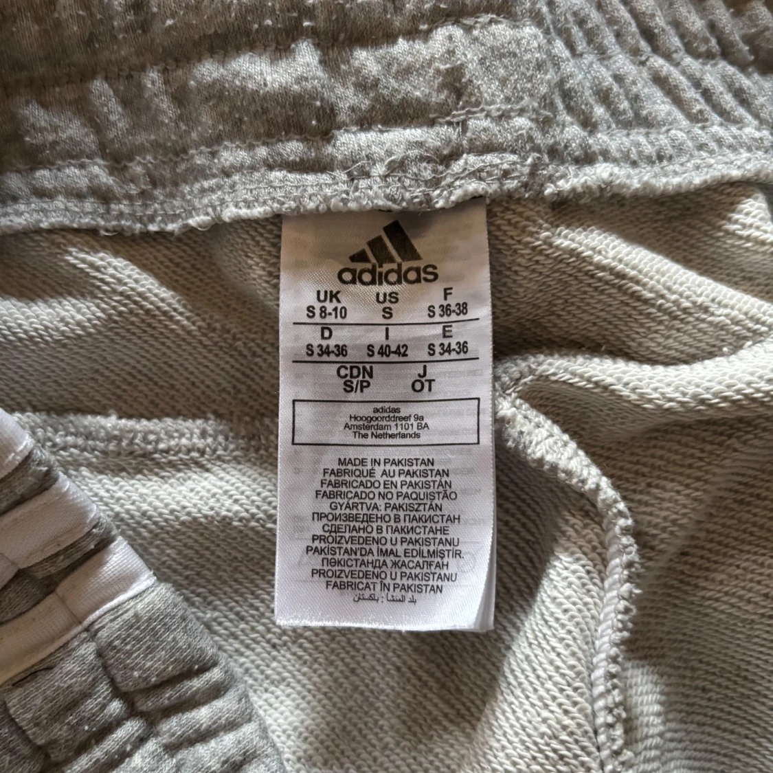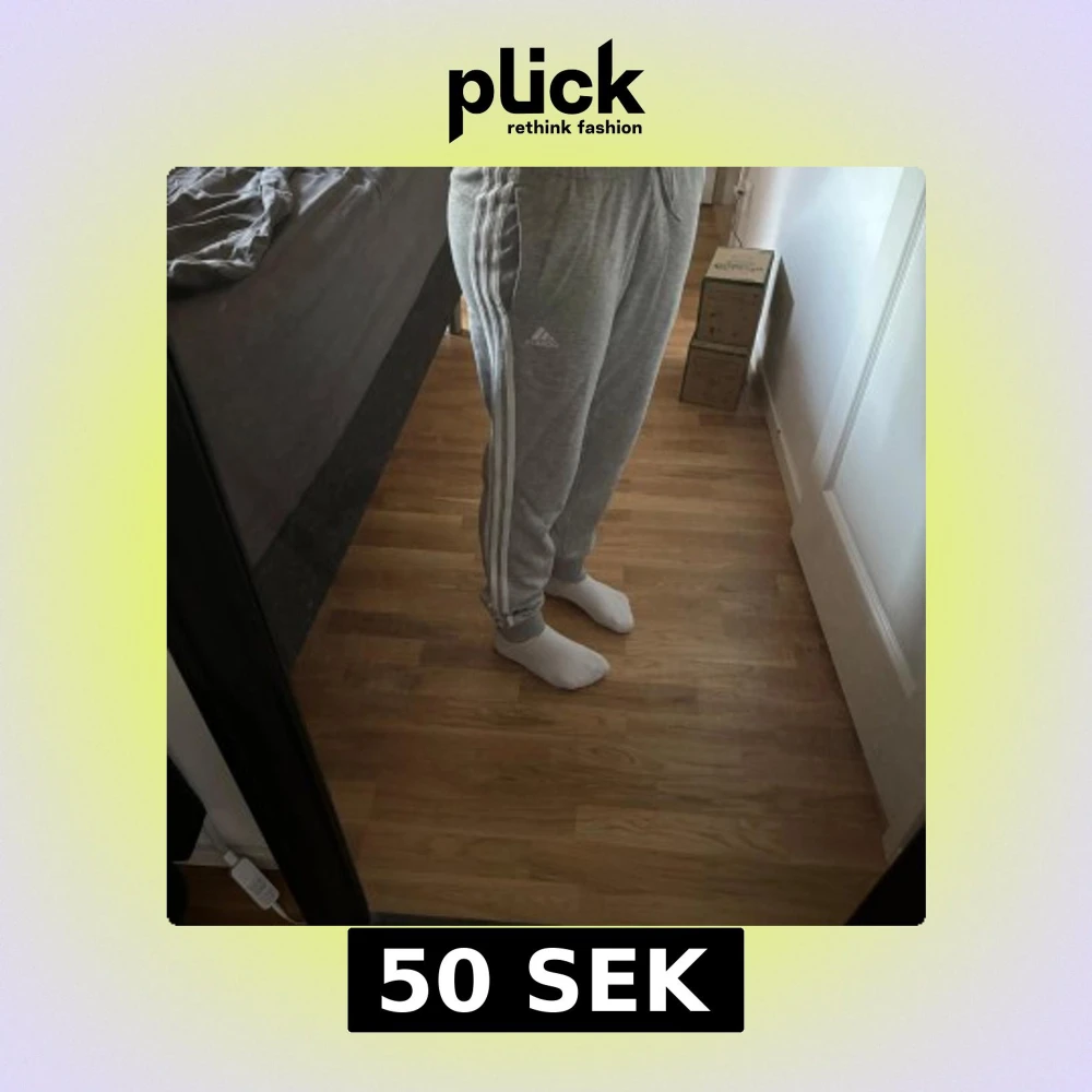 Säljer ett par grå mjukisbyxor från Adidas med klassiska vita ränder längs sidorna och logga på låret. Byxorna har resår i midjan och är perfekta för en avslappnad stil.