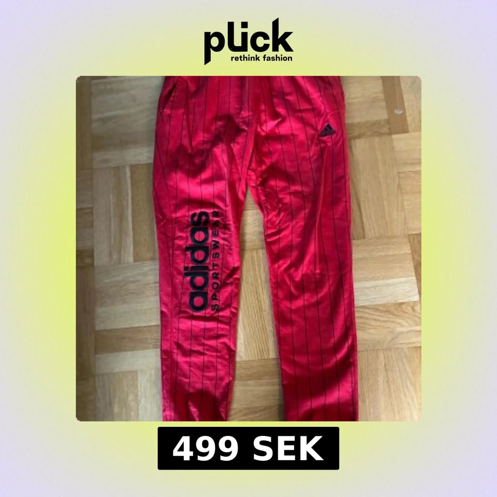 Säljer ett par röda adidas byxor med svarta tunna vertikala ränder och stor adidas-logga på ena benet. Byxorna har resår i midjan och en bakficka. Perfekta för en sportig look.