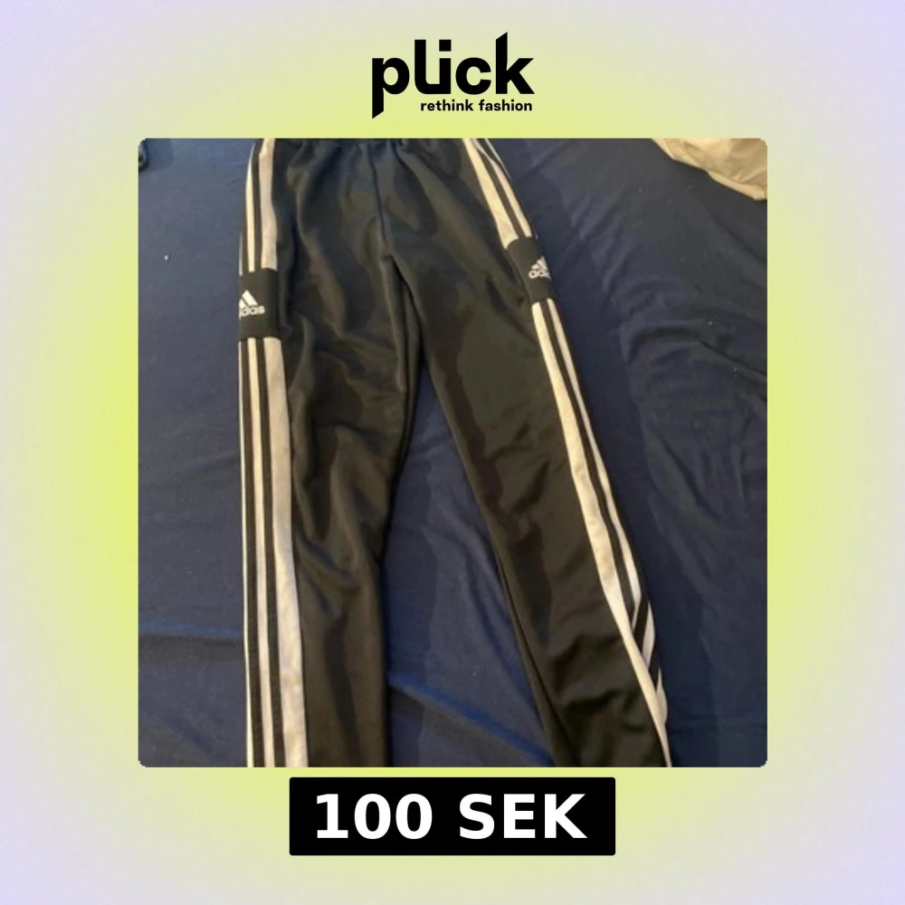 Svarta träningsbyxor från Adidas med klassiska vita ränder längs sidorna och logga på låret. Byxorna har dragkedja vid bensluten och resår i midjan. Perfekta för sport eller chill. En av zippen på ena benet är sönder men går alltid att fixa!