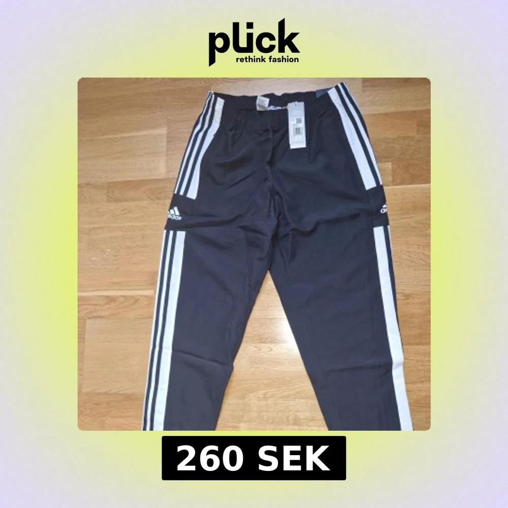Svarta träningsbyxor från Adidas med klassiska vita ränder längs benen och Adidas-logga på sidorna. Byxorna har resår i midjan och vid benslut, samt är tillverkade i ett lätt och sportigt polyestermaterial. Perfekta för dig som gillar sportig stil.