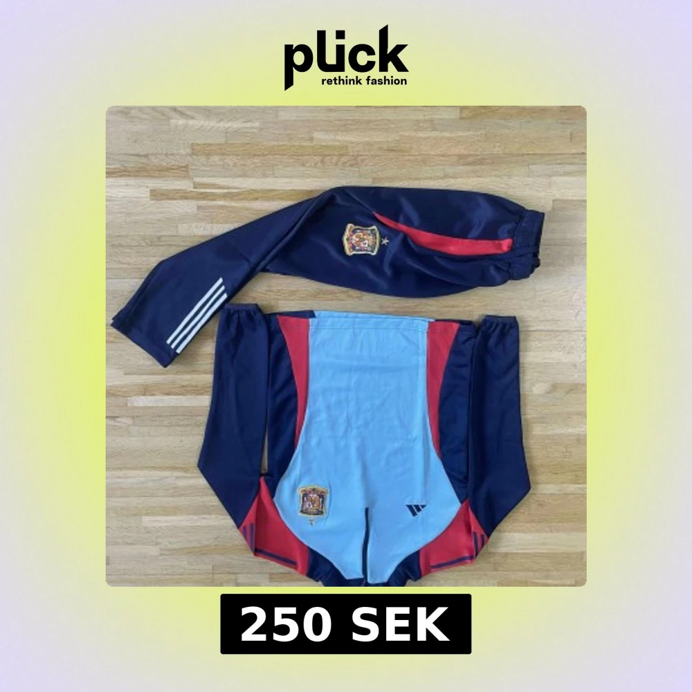 Säljer ett par mörkblå träningsbyxor från Adidas med Spaniens landslagsmärke och röda detaljer. Byxorna har elastisk midja med snörning och vita Adidas-ränder på benet. Materialet är polyester, perfekt för sport och fotboll.