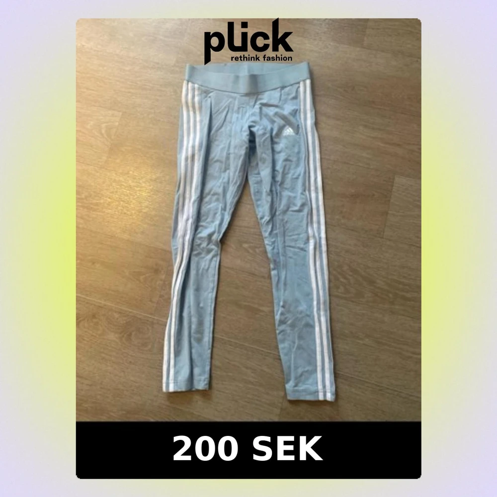 Snygga ljusblå leggings från Adidas med klassiska vita ränder längs benen och Adidas-logga på låret. Hög midja och stretchigt material som sitter tight. Perfekta för träning eller chill dagar.