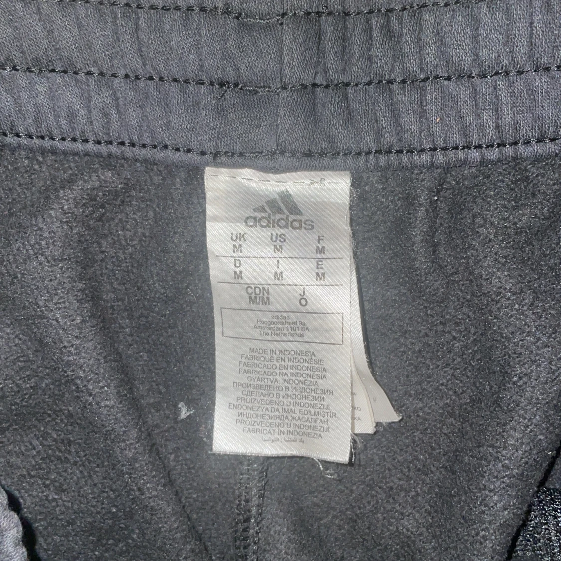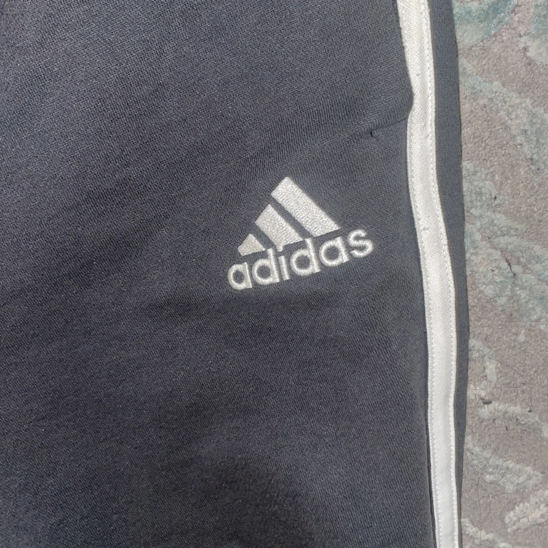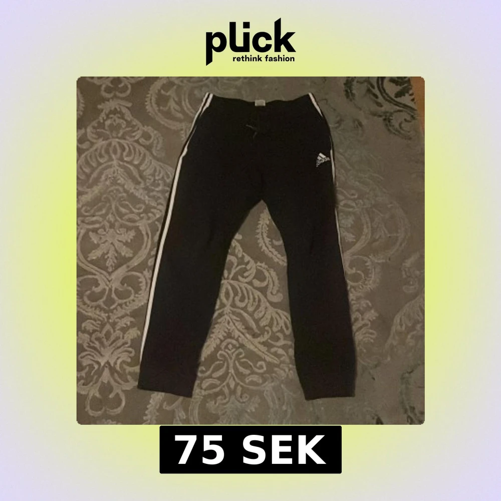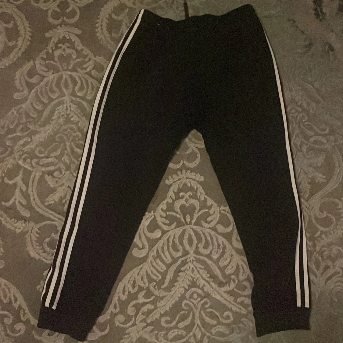 Säljer ett par svarta mjukisbyxor från Adidas med vita ränder längs sidorna och logga på benet. Byxorna har en elastisk midja och är perfekta för en avslappnad stil.