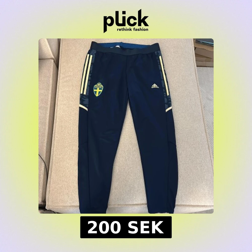 Marinblå träningsbyxor från Adidas med Sveriges landslagsemblem på ena benet och klassiska gula ränder längs sidorna. Byxorna har smal passform, elastisk midja och är tillverkade i ett syntetmaterial som andas. Perfekta för fotbollsträning eller chill.