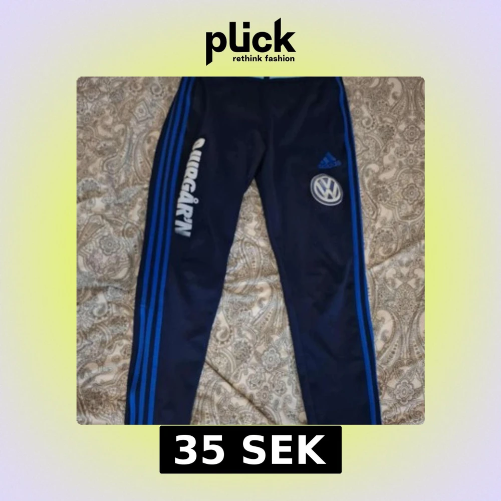 Mörkblå träningstights från Adidas med blå ränder längs sidorna och tryck av Volkswagen och AIK-logga. Tight passform och elastiskt material som passar perfekt för sport eller gym. Klassisk Adidas-design med logga på låret.