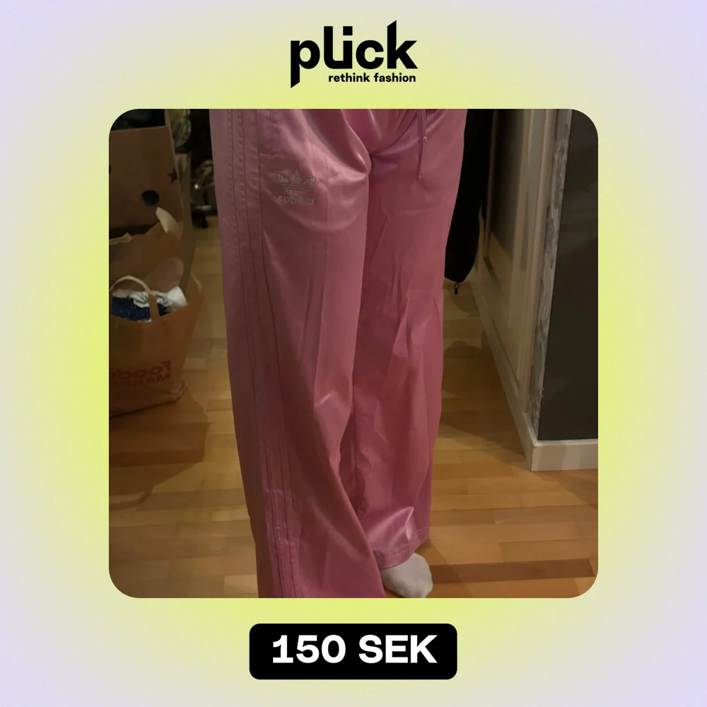 Snygga rosa träningsbyxor från Adidas med klassiska tre ränder längs sidorna. Byxorna har en loose passform och är dekorerade med Adidas-loggan i strass på benet. Det är mycket sparsamt använda