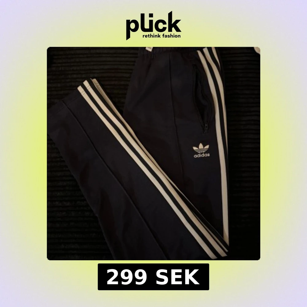 Marinblå mjukisbyxor från Adidas med klassiska vita ränder längs benen och broderad logga på låret. Byxorna har resår i midjan och dragkedjeförsedda fickor. Perfekta för en sportig och avslappnad stil.