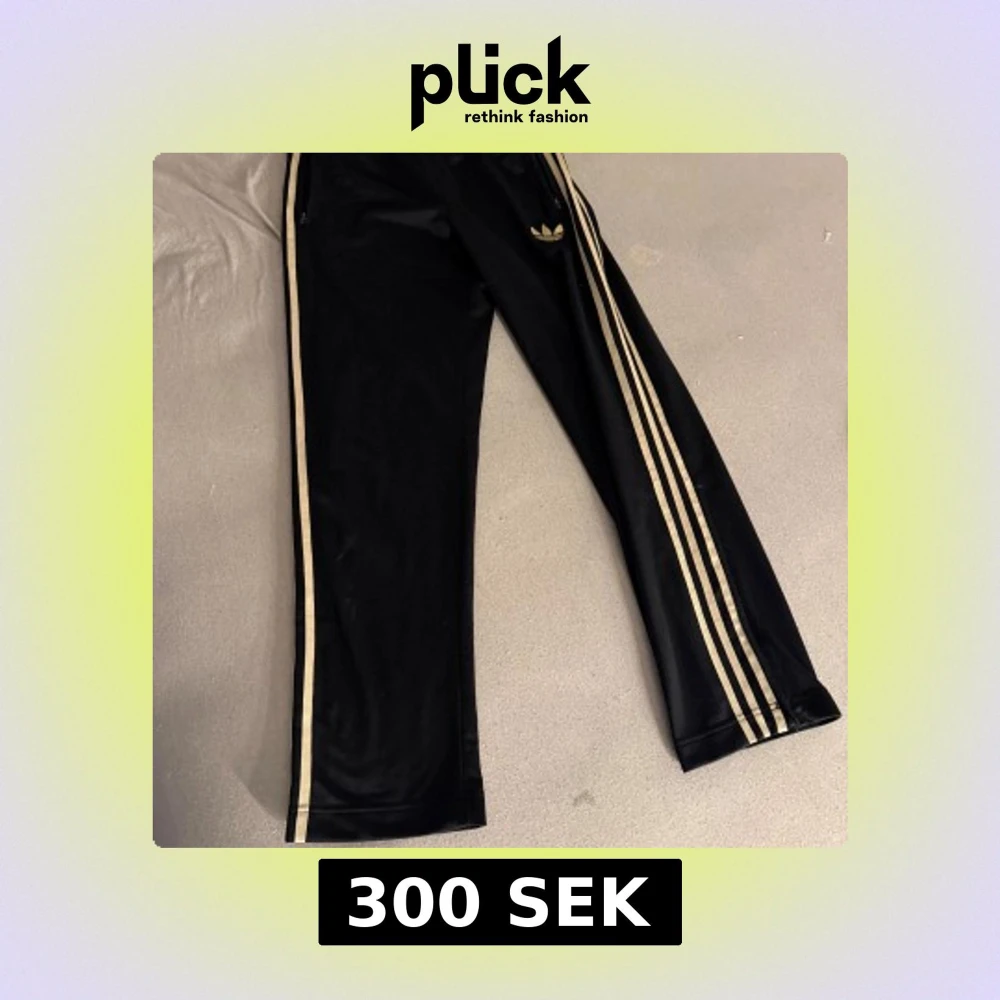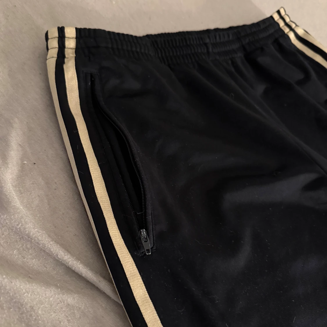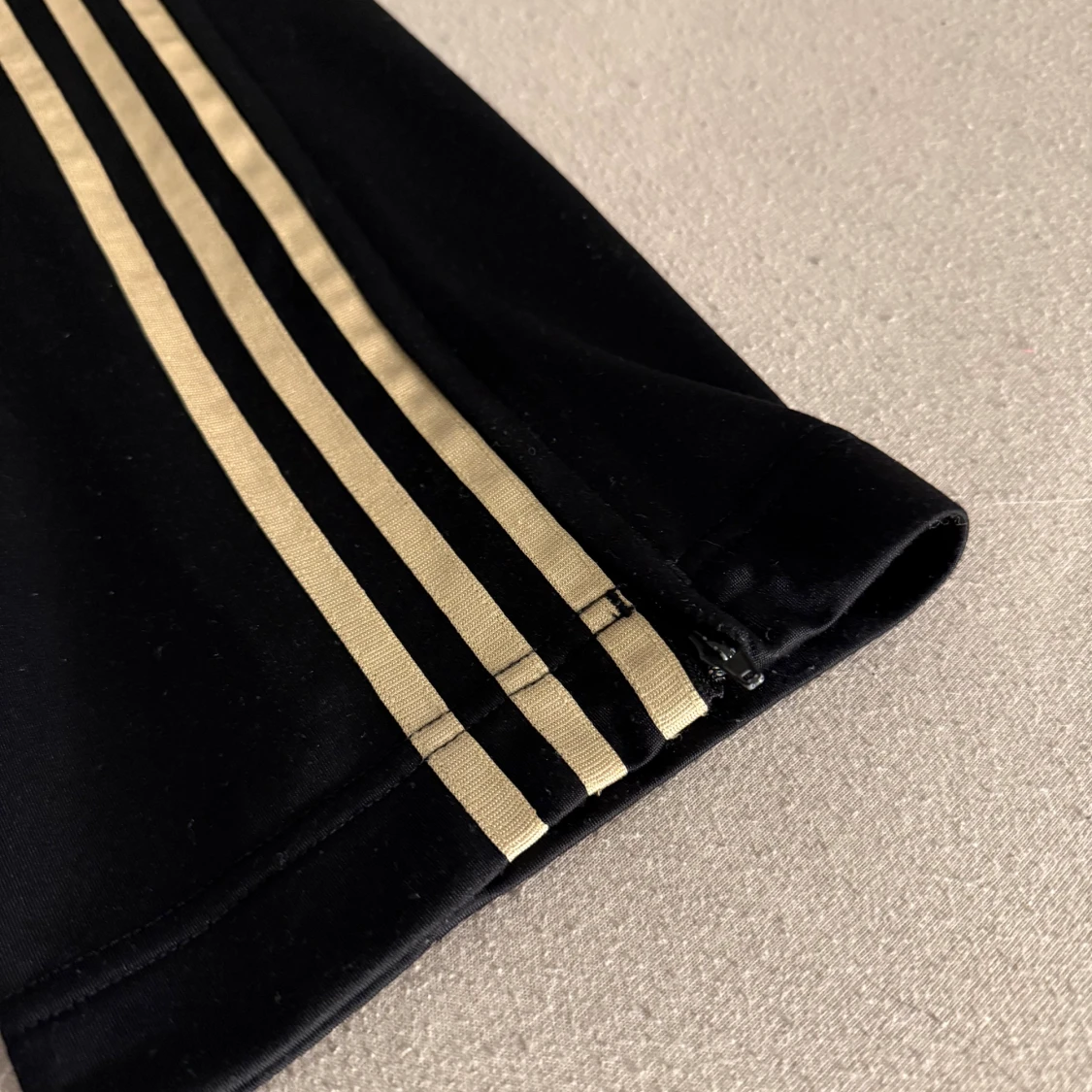 Svarta Adidas byxor med guldiga ränder längs sidorna och klassisk treklöverslogga. Byxorna har dragkedjor vid fickorna och bensluten, samt resår i midjan. Tillverkade i ett glansigt syntetmaterial som ger en sportig vibe. Dessa säljs inte längre