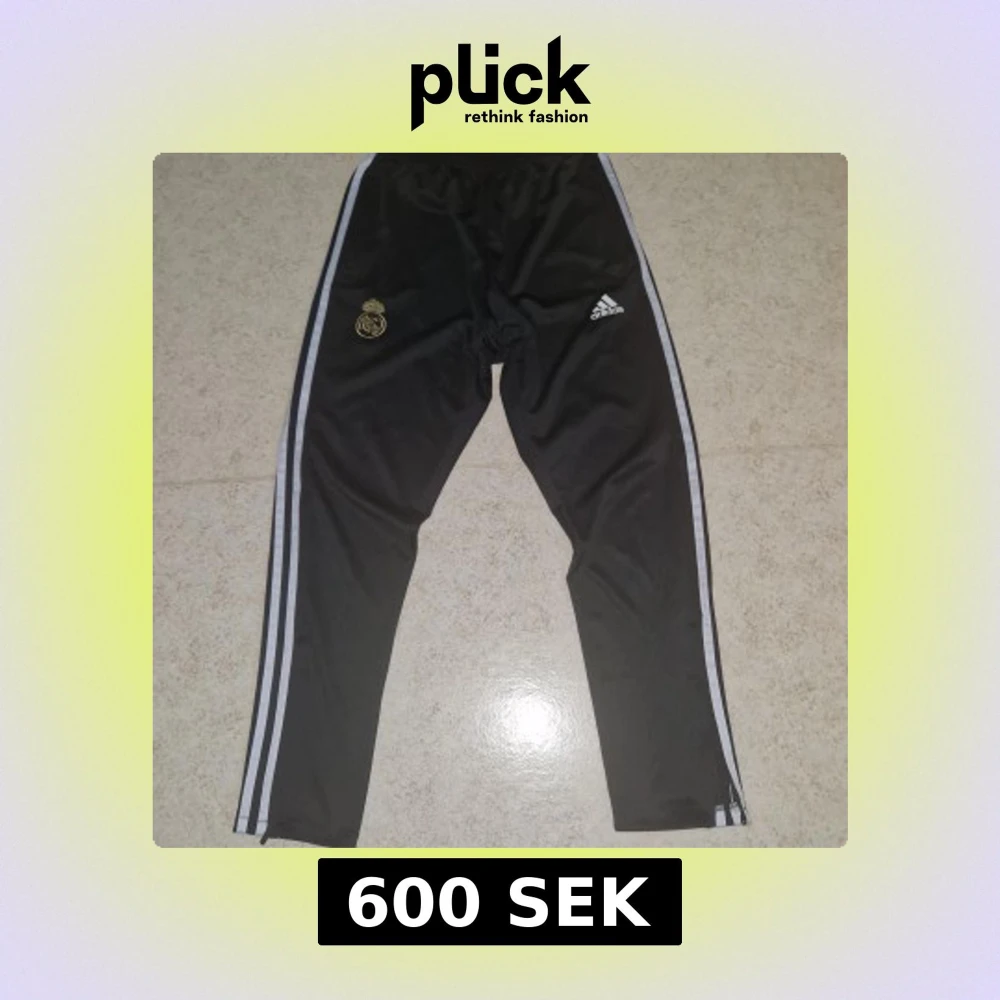 Äkta från Adidas! Svarta träningsbyxor från Adidas med Real Madrid-logga i guld och klassiska vita ränder längs sidorna. Byxorna har smal passform, resår i midjan och är gjorda i polyester. Perfekta för fotbollsträning eller chill.